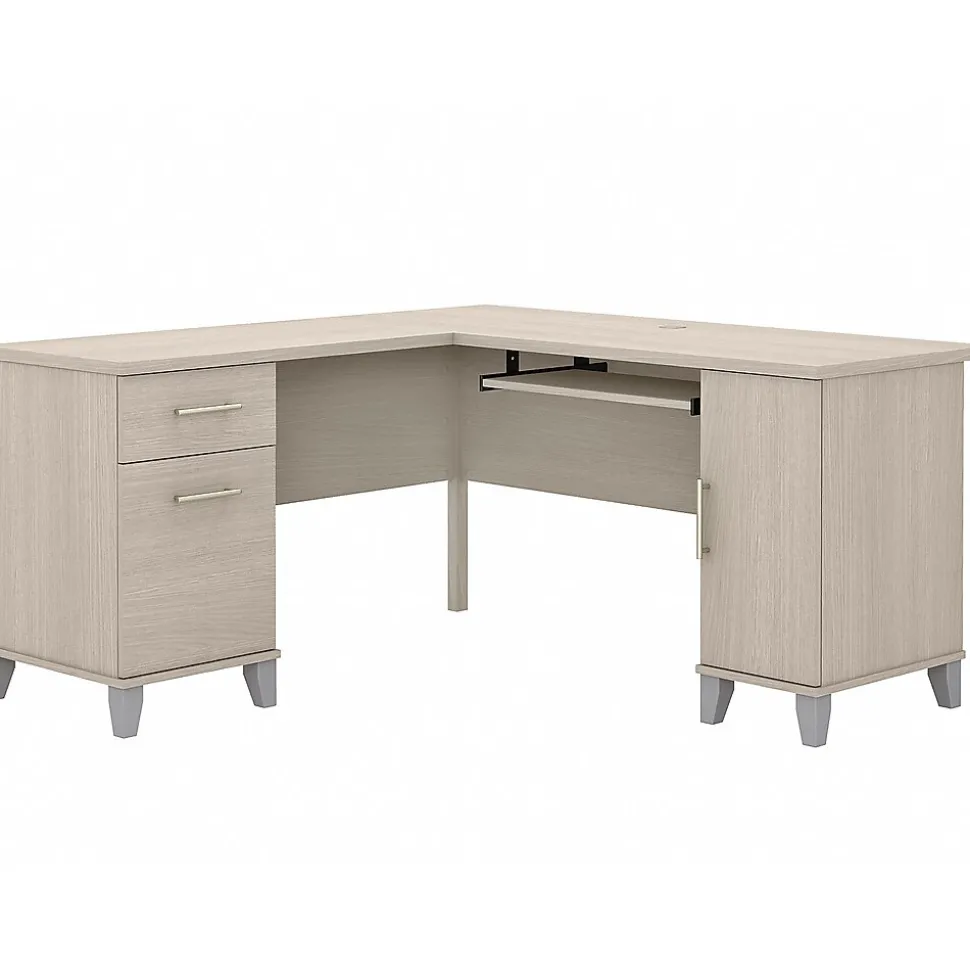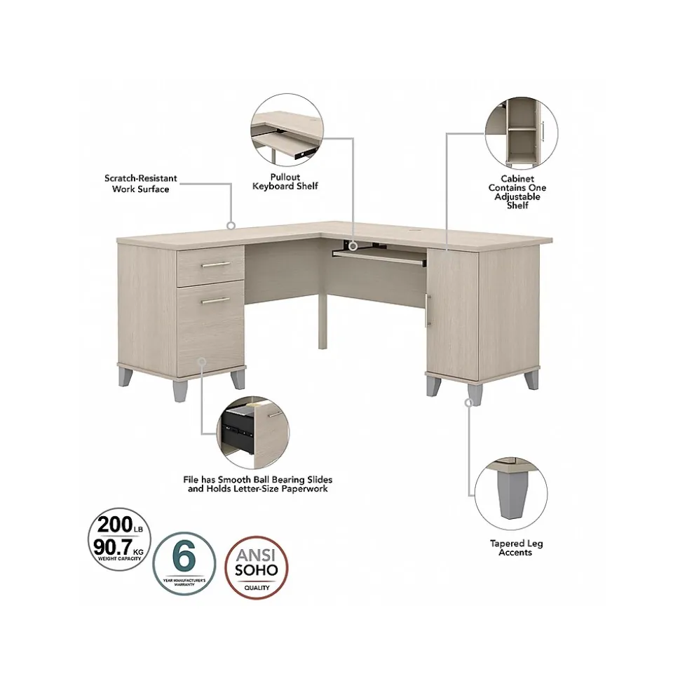 Maximize the potential of your home office with the Bush Furniture Somerset 60″W L-shaped desk. Create your remote work headquarters with space for a computer, phone, printer, and more on a surface that features wire management slots for keeping cords and cables in order. A convenient pull-out shelf provides a perfect place to keep a keyboard or laptop, and the desk also includes a vertical storage cabinet with an adjustable shelf. Place pens, paper, and more in the box drawer, and enjoy a file drawer gliding on smooth, ball-bearing slides for an easy reach to documents. Transitional styling includes a stylish finish with tapered legs and contemporary metal hardware for an alluring appearance. This desk with storage is tested to meet ANSI/SOHO standards for safety and performance and is backed by the 6-year manufacturer warranty. American-made with US and imported parts.