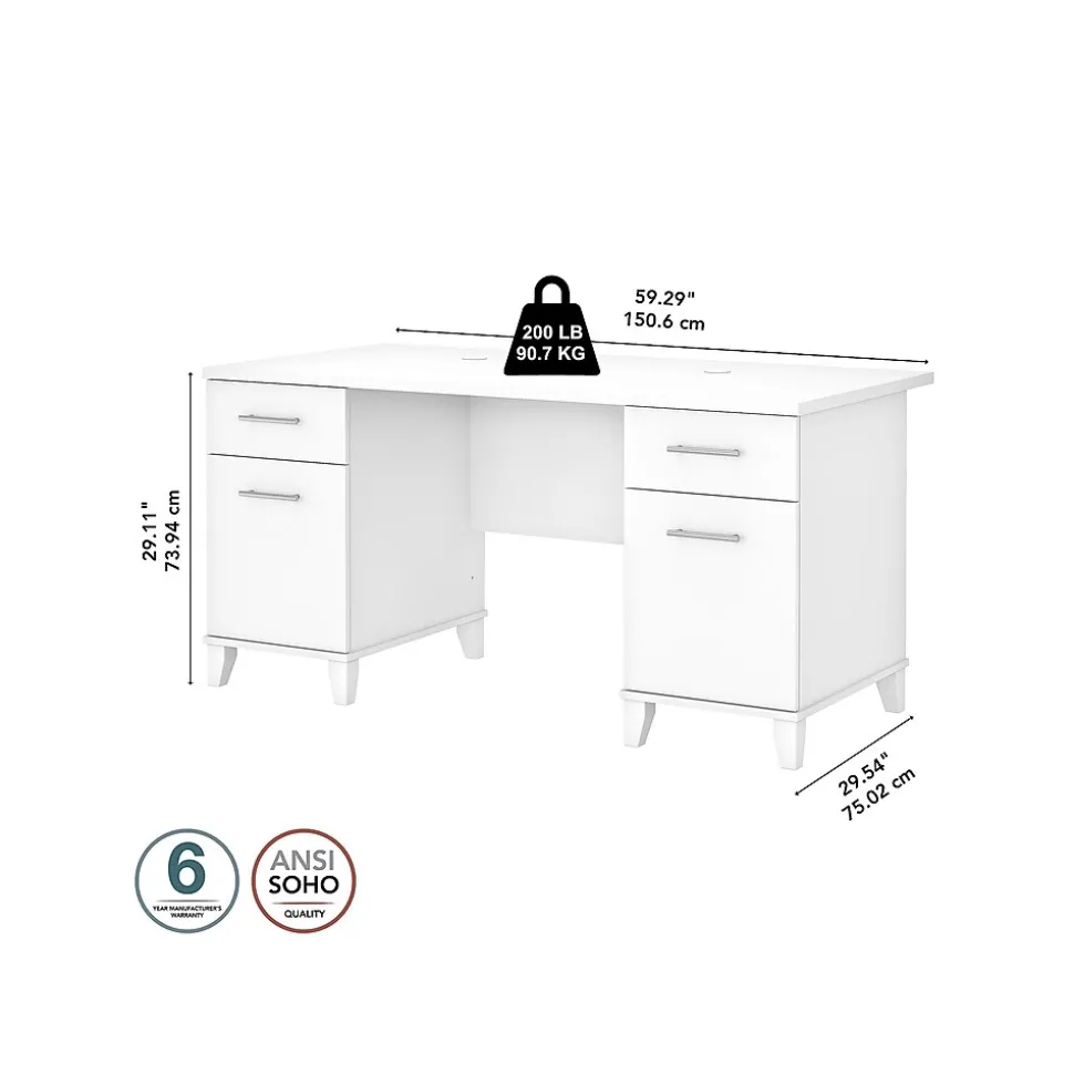 Make the best use of your workspace with the Bush Furniture Somerset 60″W office desk. A perfect choice for your home office, the extended surface provides plenty of room to spread out and features built-in wire management grommets to keep cords in order. Stay organized with two box drawers to house miscellaneous office supplies and two file drawers with smooth ball bearing slides for storing letter-sized documents. The desk in transitional styling offers tapered leg accents, an elegant finish, and contemporary metal hardware for an alluring appearance. This computer desk with drawers is tested to meet ANSI/SOHO quality standards for safety and performance and is backed by the Bush Furniture 6-year manufacturer limited warranty. See the full Somerset collection for coordinating items to complete your personal workspace. American-made with US and imported parts.