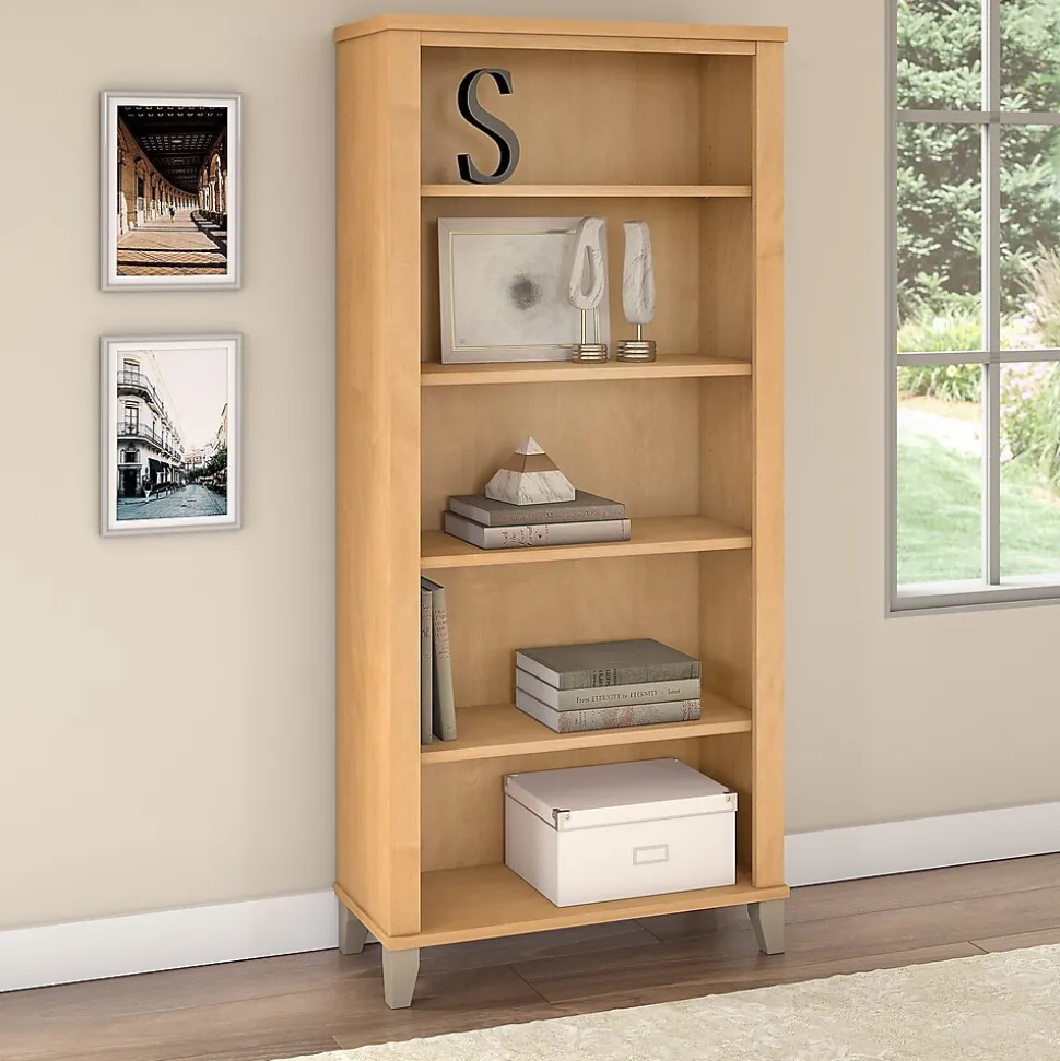 Turn any space into your own personal library with the Bush Furniture Somerset 5 Shelf Bookcase. With a tapered leg design and your choice of three beautiful finishes, this bookshelf is a perfect choice to complete your home office. Two shelves are fixed to provide structural strength, and three are adjustable so your items are sure to fit. The height of the Bookcase matches that of a Somerset Desk with Hutch combination to create a coordinated appearance. Its sturdy construction and durable laminate finish allow you to display books, trinkets and more for years to come. This quality furniture is tested to meet ANSI/SOHO standards for safety and performance and is backed by the Bush Furniture 6 Year Manufacturer’s Warranty. See the full Somerset Collection for coordinating items to expand your home office. American made with U.S. and imported parts.