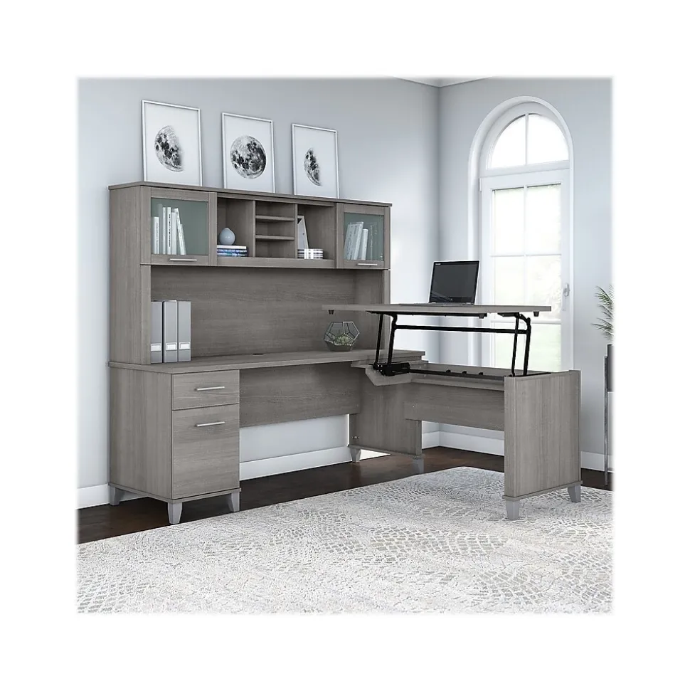 The Bush Furniture Somerset 72″W three-position sit to stand L-shaped desk with hutch offers a perfect solution for those seeking for a stylish and functional ergonomic workspace. The built-in mechanical Lift-n-Lock system allows the desktop to lock into place at standing heights of 35″, 38″, and 41″ and easily return to a seated position. This office desk includes a file drawer that opens on full-extension ball bearing slides for easy access to legal- and letter-size documents and a box drawer for supplies and utensils. The hutch attaches to the desktop and adds two frosted glass doors for concealed storage in addition to open cubby spaces with two shelves. Fixed surfaces are tested to meet ANSI/SOHO standards for safety and performance while the mechanical lift is rigorously tested to Bush Furniture quality standards.