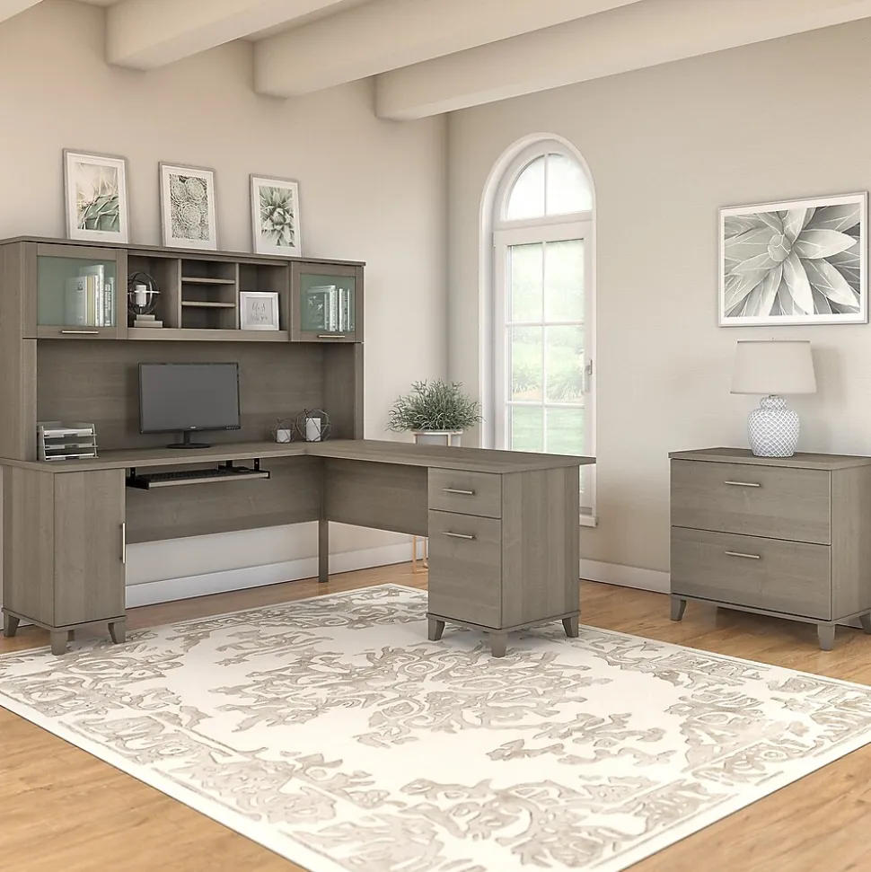 Build your ideal home office around the stylish and functional Bush Furniture Somerset 72W L Shaped Desk with Hutch and Lateral File Cabinet. The 72W surface with wire management offers ample room to spread out while a pull-out shelf for a keyboard or laptop, vertical cabinet, box drawer and file drawer provide plenty of storage for supplies. The Hutch has open compartments and 2 lift-up frosted glass doors for concealed storage. The Lateral File Cabinet utilizes smooth ball bearing slides for easy access to legal and letter size files and interlocking drawers to reduce the likelihood of tipping. Transitional styling includes your choice of four stylish finishes with tapered leg accents and contemporary metal hardware. This office furniture set is tested to meet ANSI/SOHO standards for safety and performance and is backed by the Bush Furniture 6 Year Manufacturer’s Warranty.