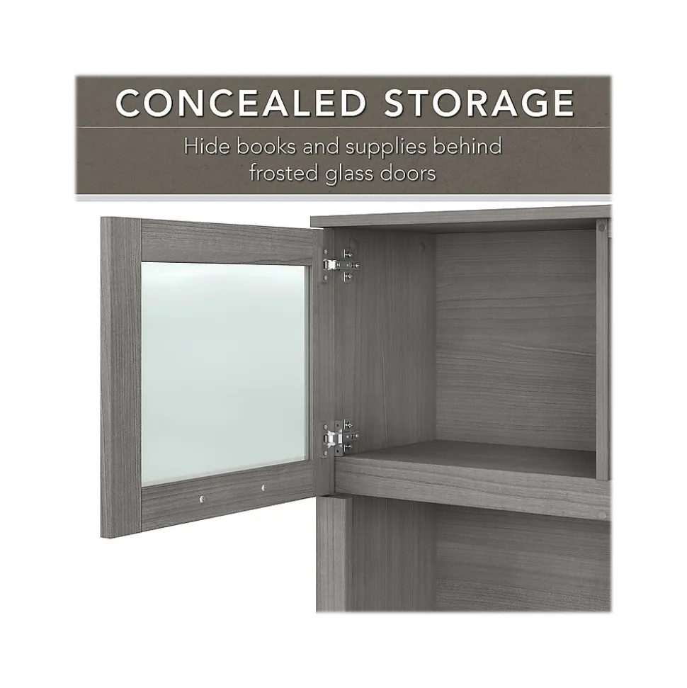 Build your perfect home office around the stylish and functional Bush Furniture Somerset L-shaped desk with hutch and lateral file cabinet. The 72″W surface with wire management grommets offers ample room to spread out while a pull-out tray for a keyboard or laptop, vertical cabinet, box drawer, and file drawer provide plenty of storage space for supplies. The hutch has open compartments and two frosted glass doors for concealed storage. The lateral file cabinet features smooth ball-bearing slides for easy access to legal- and letter-size paperwork and drawers that open one at a time for maximum stability. The transitional styling includes an attractive finish with tapered leg accents and contemporary metal hardware. This home office furniture set is tested to meet ANSI/SOHO quality standards for safety and performance.