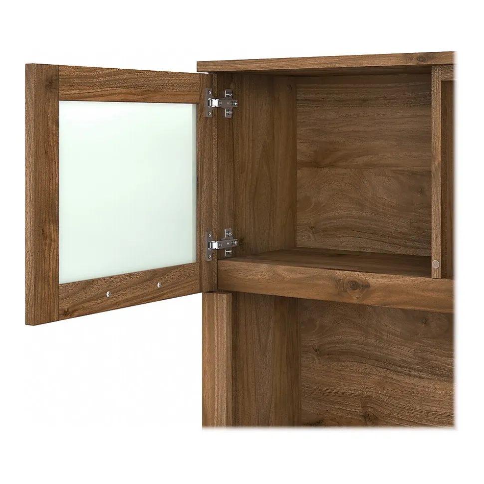 - Hutch has open compartments with two shelves and closed storage areas with glass doors