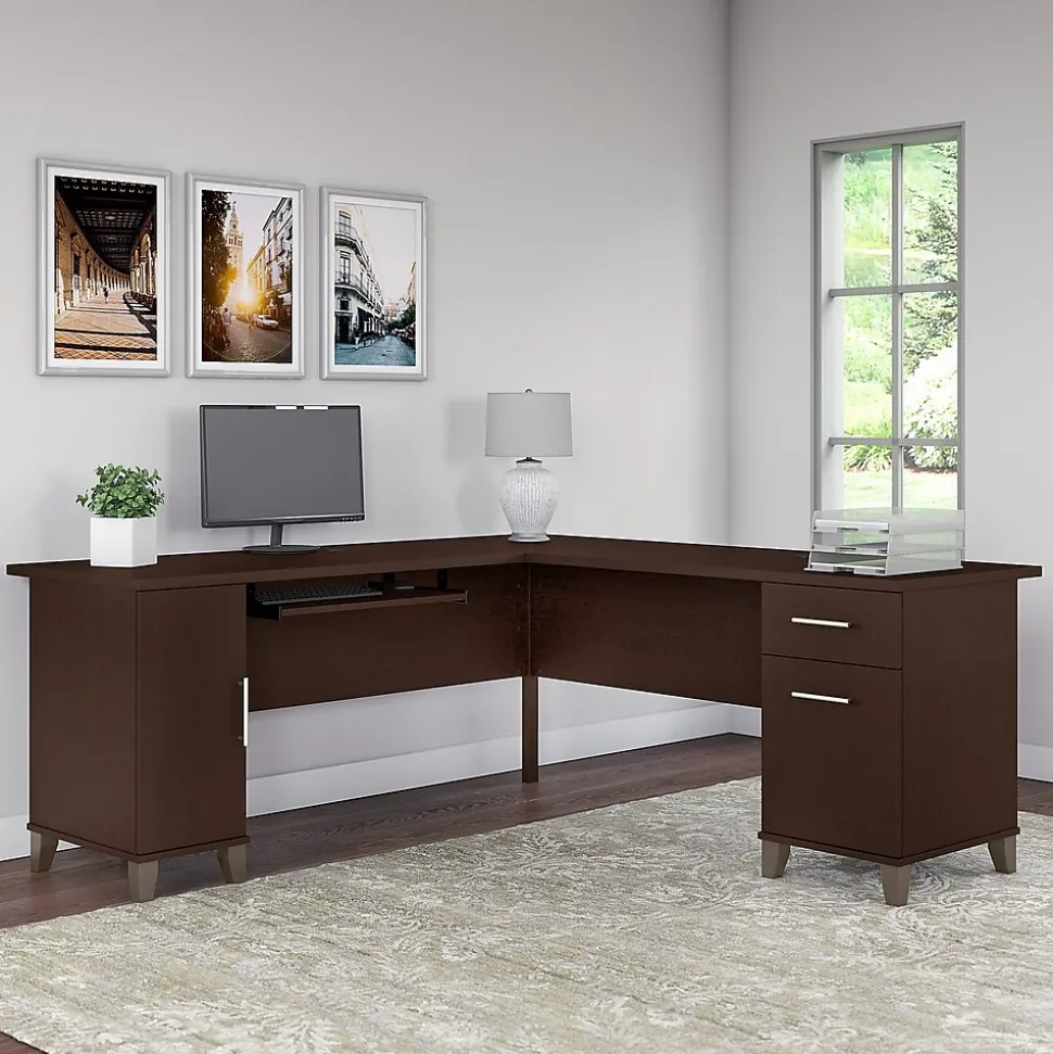 Maximize the potential of your home office with the Bush Furniture Somerset 72W L Shaped Desk. Create your remote work headquarters with space for a computer, phone, printer and more on a surface that features wire management slots for keeping cords and cables in order. A convenient pull-out shelf provides a perfect place to keep a keyboard or laptop, and the Desk also includes a vertical storage cabinet with an adjustable shelf. Place pens, paper and more in the box drawer, and enjoy a file drawer gliding on smooth ball bearing slides for an easy reach to documents. Transitional styling includes a stylish finish with tapered legs and contemporary metal hardware for an alluring appearance. This quality office desk is tested to meet ANSI/SOHO standards for safety and performance and is backed by the Bush Furniture 6 Year Manufacturer’s Warranty. American made with U.S. and imported parts.