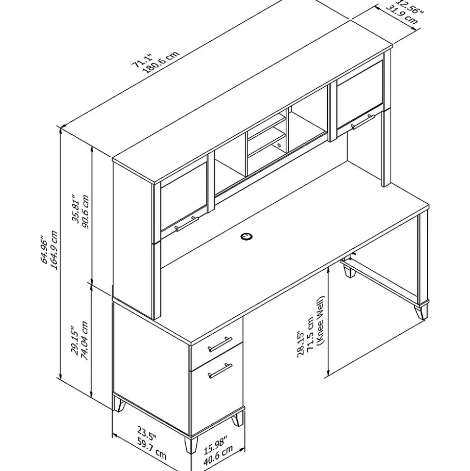 A spacious work surface and plenty of storage capacity make the Bush Furniture Somerset 72W Office Desk with Hutch a perfect choice for your home office. Spread out with a computer and paperwork while multitasking on an expansive desktop that includes wire management to keep cords and cables in order. The desk’s file drawer opens on full-extension ball bearing slides for easy access to legal and letter size documents, while a box drawer keeps the office supplies and utensils you need close by. The Hutch attaches to the desktop and adds a pair of lift-up frosted glass doors for concealed storage in addition to open cubby spaces with 2 adjustable shelves for books, binders, decorations and more. The Office Desk with Drawers and Hutch set is tested to meet ANSI/SOHO quality standards for safety and performance and is backed by the Bush Furniture 6 Year Manufacturer’s Warranty.