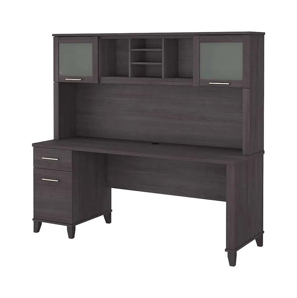 The transitional Bush Furniture Somerset 71″ office desk with hutch offers a stylish and practical workspace solution for the home or small office. A spacious work surface and plenty of storage capacity make this desk with drawers and hutch a perfect choice for your home office. Spread out with a computer and paperwork while multitasking on an expansive desktop that includes a wire management grommet to keep cords and cables in order. The desk’s file drawer opens on smooth full-extension ball bearing slides for easy access to legal- and letter-size documents, while a box drawer keeps the office supplies and utensils you need close by. The hutch attaches to the desktop and adds a pair of frosted glass doors for concealed storage in addition to open cubby spaces with two shelves for books, decorations, and more. This home office desk with drawers and hutch set is tested to meet ANSI/SOHO quality standards for safety and performance and is backed by the Bush Furniture 6-year manufacturer warranty.