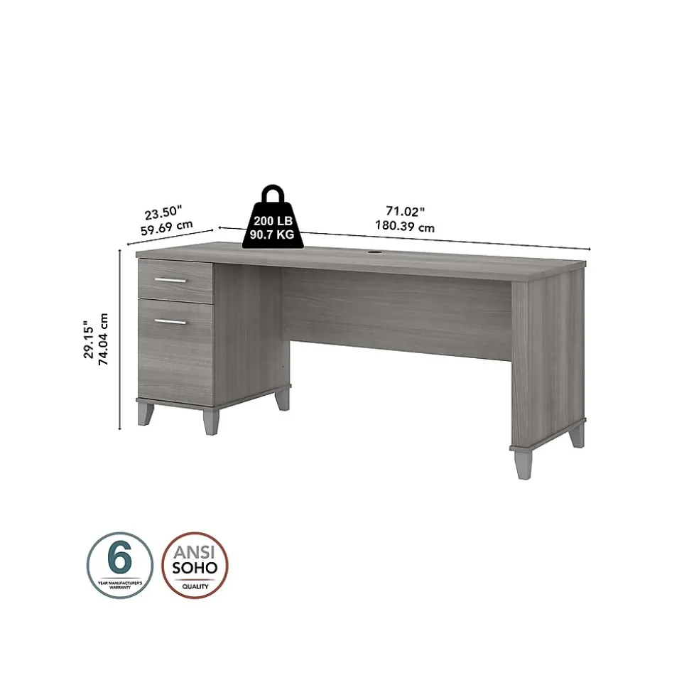 - Spacious 71″W work surface offers plenty of room to spread out with a computer and paperwork