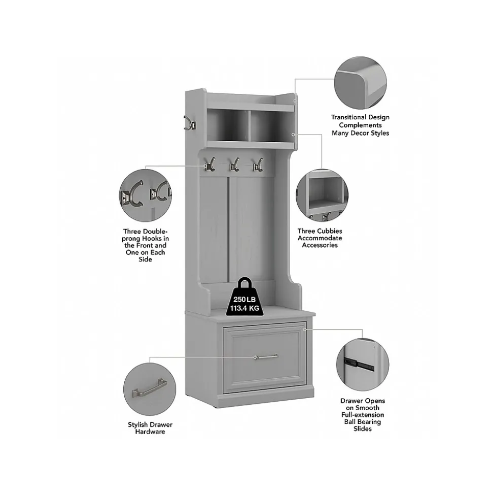 The Bush Furniture Woodland 24W Hall Tree and Small Shoe Bench with Drawer combines transitional styling and a practical design to offer an ideal entryway organizer. Have a seat on the durable bench and take a moment to relax as you get ready to head out the door or come home after a long day. The top of the mudroom bench supports 250 pounds, so you can sit down to put on and take off your shoes or set bags down with confidence. A small drawer opens on smooth ball bearing slides for easy access to footwear and accessories. The narrow Hall Tree features three coat hooks in the front and one on each side for hanging jackets, hats, and more. Smaller items like gloves and keys can be stashed inside two open compartments. This entryway bench with storage has been rigorously tested to meet Bush Furniture’s standards for safety, performance and durability and is backed by a 3 Year Warranty.