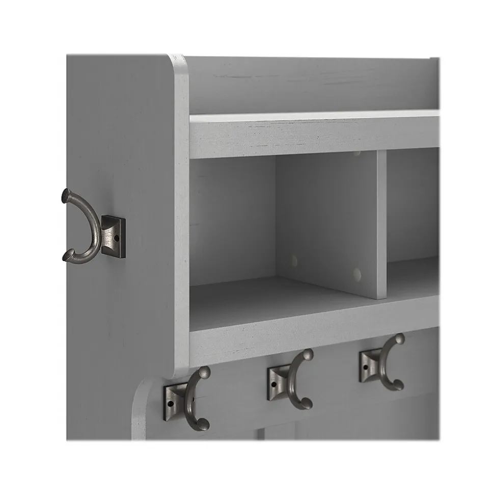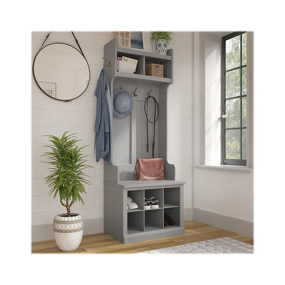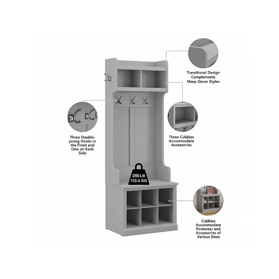The Bush Furniture Woodland 24W Hall Tree and Small Shoe Bench with Shelves combines transitional styling and a practical design to offer an ideal entryway organizer. Have a seat on the durable bench and take a moment to relax as you get ready to head out the door or come home after a long day. The top of the mudroom bench supports up to 250 pounds, so you can sit down to put on and take off your shoes or set bags down with confidence. Six built-in cubby spaces keep your home organized while providing easy access to footwear. The narrow Hall Tree features three coat hooks in the front and one on each side for hanging jackets, hats, and more. Smaller items like gloves and keys can be stashed inside two open compartments. This entryway bench with storage has been rigorously tested to meet Bush Furniture’s standards for safety, performance and durability and is backed by a 3 Year Warranty.