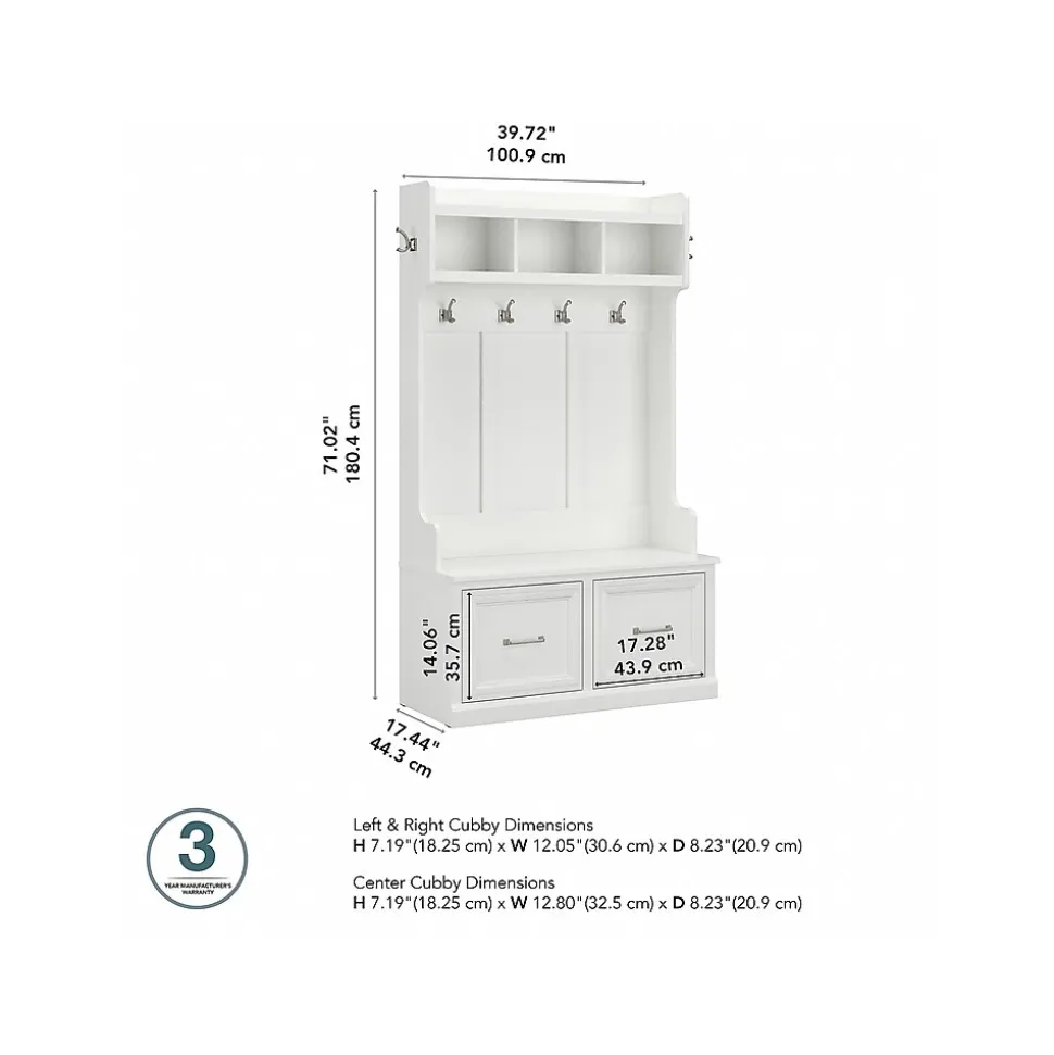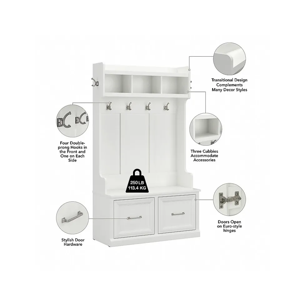 The Bush Furniture Woodland 40W Hall Tree and Shoe Storage Bench with Doors combines transitional styling and a practical design to offer an ideal entryway organizer. Have a seat on the durable bench and take a moment to relax as you get ready to head out the door or come home after a long day. The top of the mudroom bench supports 250 pounds, so you can sit down to put on and take off your shoes or set bags down with confidence. Cabinet doors conceal two internal compartments that keep footwear in order and out of sight. The Hall Tree includes four coat hooks in the front and one on each side for hanging jackets, hats, scarves and more. Smaller items like gloves and keys can be stashed inside three open cubby spaces. This entryway bench with storage has been rigorously tested to meet Bush Furniture’s standards for safety, performance and durability and is backed by a 3 Year Warranty.