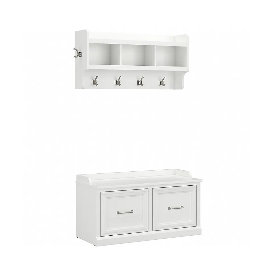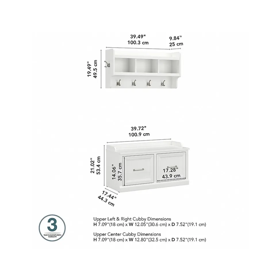 The Bush Furniture Woodland 40W Shoe Storage Bench with Doors and Wall Mounted Coat Rack combines transitional styling and a practical design to offer an ideal entryway organizer. Have a seat on the durable bench and take a moment to relax as you get ready to head out the door or come home after a long day. The top of the mudroom bench supports 250 pounds, so you can sit down to put on and take off your shoes or set shopping bags down with confidence. Cabinet doors conceal two internal compartments that keep footwear in order and out of sight. The wall shelf includes six coat hooks for hanging jackets, hats, scarves and more. Smaller items like gloves and keys can be stashed neatly inside three open cubby spaces. This entryway bench and coat rack has been rigorously tested to meet Bush Furniture’s standards for safety, performance and durability and is backed by a 3 Year Warranty.
