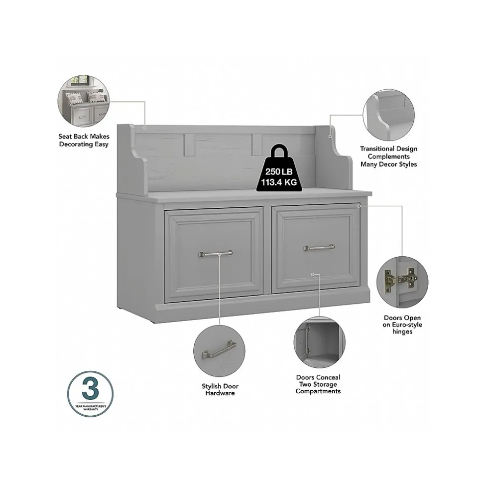 The Bush Furniture Woodland Full Entryway Storage Set with Coat Rack and Shoe Bench with Doors combines transitional styling and a practical design to offer an ideal organization solution. Have a seat on the durable storage bench and take a moment to relax as you get ready to head out the door or come home after a long day. Each section of the long mudroom bench supports 250 pounds, so you can sit down to put on and take off your shoes with confidence. Two small storage cabinets and cube shelving accommodate footwear and accessories for a clutter-free entryway, mudroom or foyer. The narrow hall trees and wall mounted shelf include a total of 10 coat hooks in the front and one on each side for hanging jackets, hats, and more. This entryway bench and coat rack set has been tested to meet Bush Furniture’s standards for safety, performance and durability and is backed by a 3 Year Warranty.
