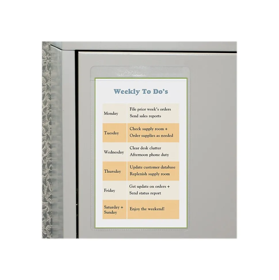 - Welded, super heavyweight graded job ticket holder with short-side load orientation and peel-and-stick adhesive backing
