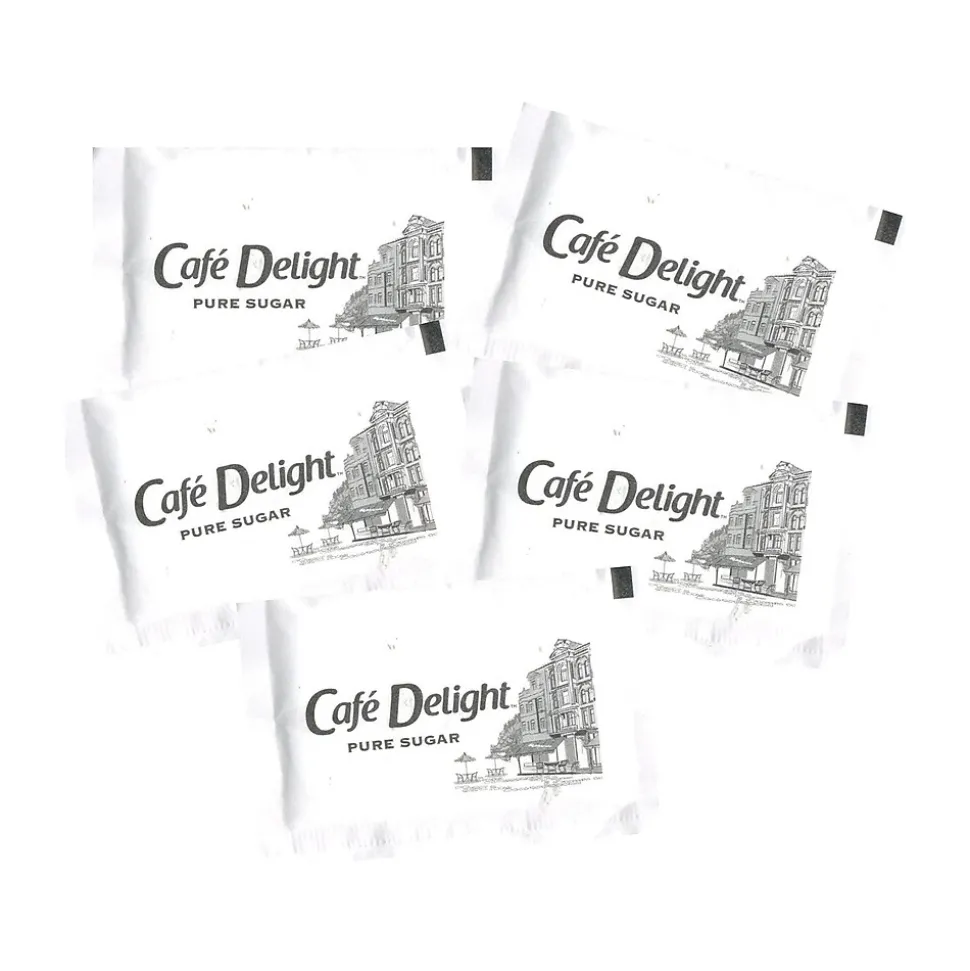Add a dash of sweetness to coffees, teas, and other drinks with these sugar packets. The pre-measured design makes it easy to get just the right amount of sugar, while the individual packaging ensures that contents stay dry and clean. These Cafe Delight packets are made with 100 percent cane sugar and come with 1000 to a box for convenient stocking.