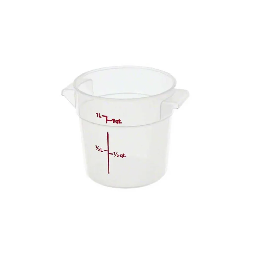 Cambro® Food storage container in clear color is made of polypropylene for durability and has a capacity of 1 qt to store kitchen essentials. Container with 6″ Dia has a height of 5″ and can withstand temperatures range of -40 – 160 deg F.