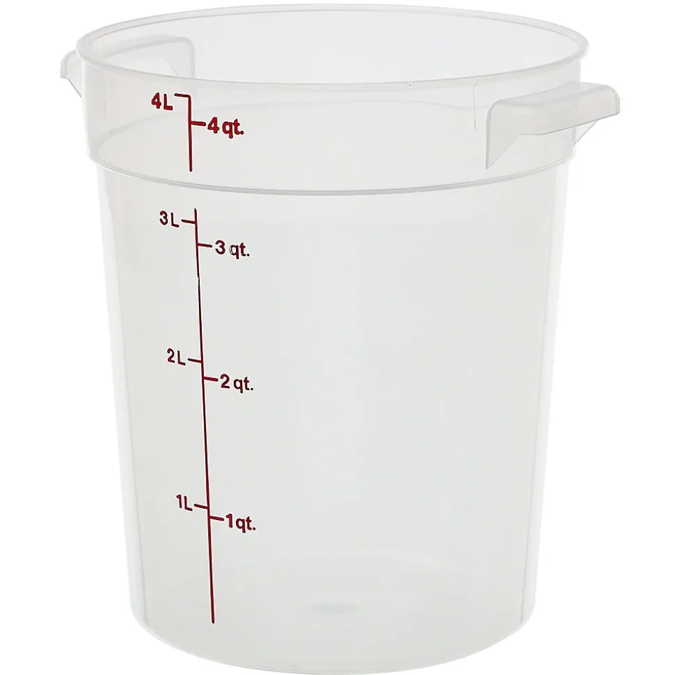 Cambro® Food storage container in clear color is made of polypropylene for durability and has a capacity of 4 qt to store kitchen essentials. Container with 8 1/5″ Dia has a height of 8 1/3″ and can withstand temperature ranges of -40 to 160 deg F.