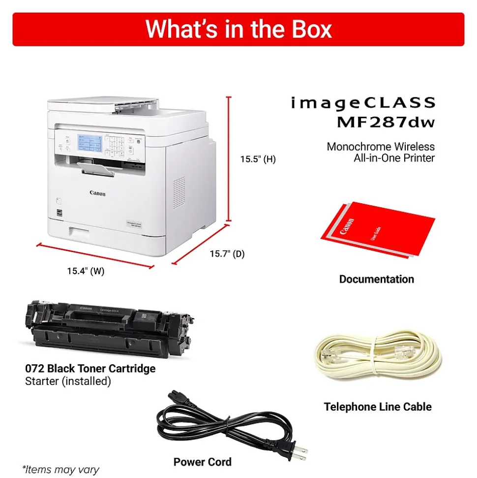 Designed for small office environments, the imageCLASS MF287dw model balances speedy performance and minimal maintenance. The MF287dw is easy to set up and offers media versatility to print on a variety of media types and sizes. Produce crisp, bold documents with fast print speeds of up to 35 pages per minute, using high quality Canon Genuine Toner 072 / 072 H. The MF287dw offers paper capacity of up to 250 sheets in the paper tray and 35-sheet automatic document feeder. The 6-line, adjustable touchscreen delivers an intuitive user experience. Easily connect and print through wirelessly from computers or mobile devices. Print using a variety of mobile apps, including the Canon PRINT app using your compatible mobile device. The MF287dw is also Chromebook compatible, so you can print schoolwork and other documents hassle-free. The MF287dw comes with a 1-year limited warranty and is backed by Canon’s Service and Support network.