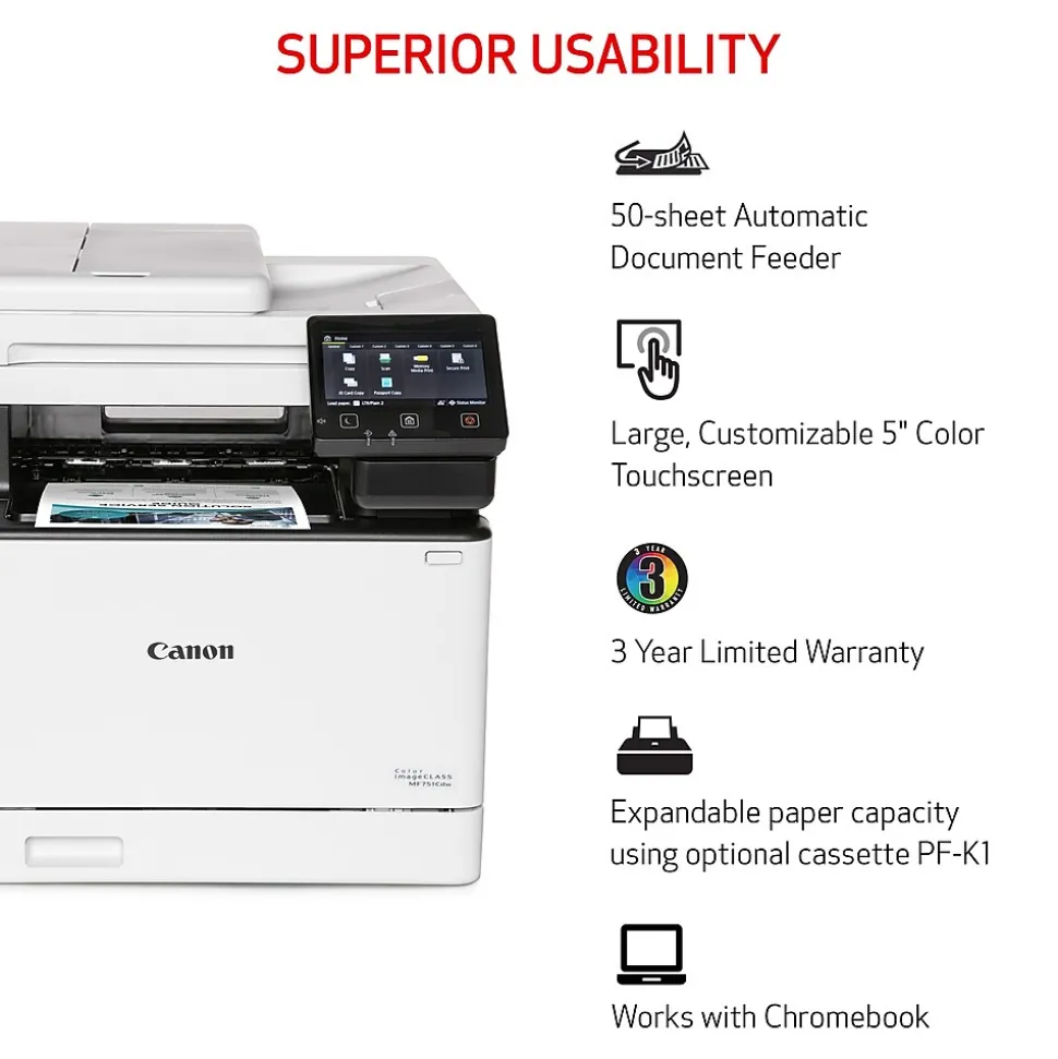 Canon Color imageCLASS’s diverse features and durability give you the confidence and flexibility to print everything from beautiful photos to impressive documents at home and in your small office. The MF751Cdw offers print, scan, and copy capabilities and can print up to 35 pages per minute. High-capacity toner option keeps up with your printing needs and limits toner replacement interruptions. Connect this printer to a wireless network in four simple steps. Print on the go with Canon PRINT Business, Apple AirPrint, and Mopria Print Service. Compatible with Windows, macOS, and ChromeOS. Standard paper capacity provides up to 250 sheets in the cassette and 50 sheets in the multipurpose tray. Optional cassette PF-K1 provides up to 550 sheets, giving up to 850 sheets of paper capacity (not included).
