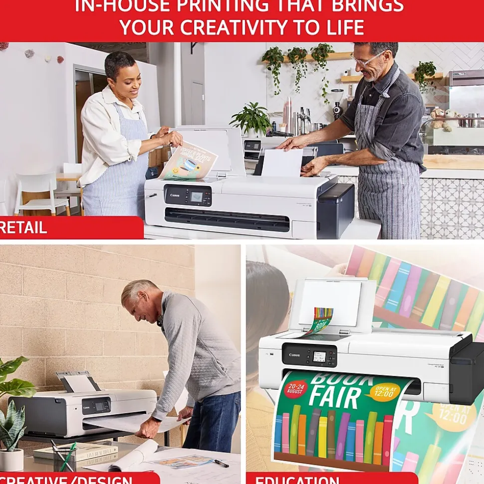 The Canon imagePROGRAF TC-20M printer is designed to provide the versatility to help create high-quality CAD drawings, posters and large prints. Compact and easy to operate, this large format (24” wide output) printer will allow you to experience greater productivity and boost your workfl ow, even in small workplaces, with the added ability to print from Letter/A4 to A1 sizes.