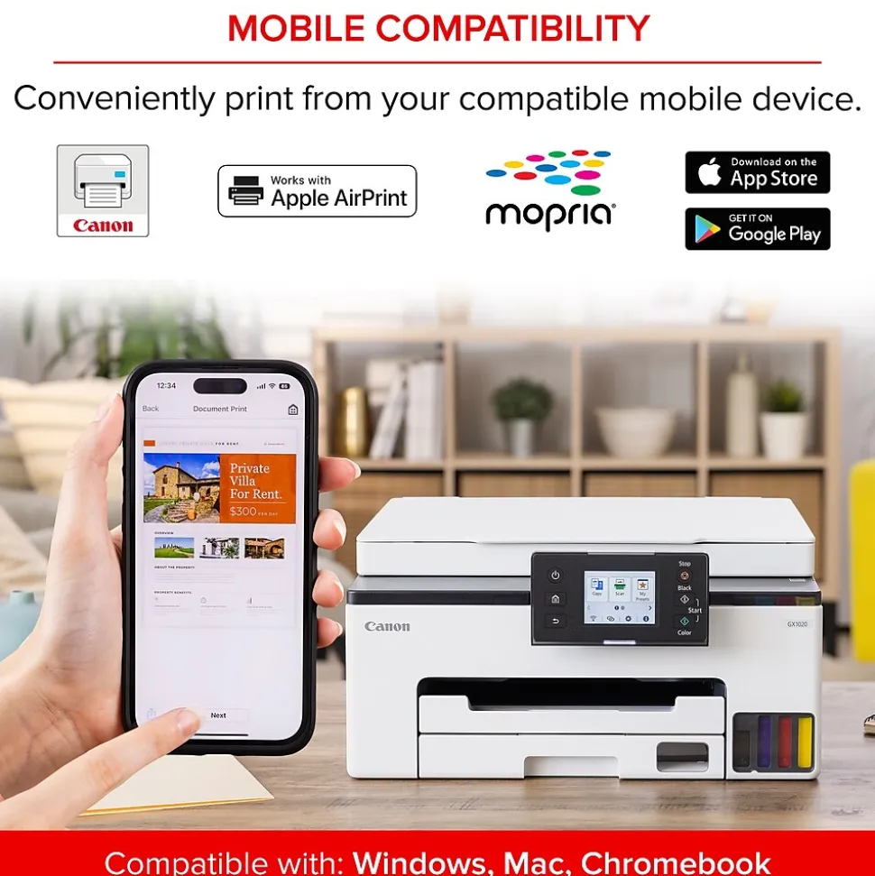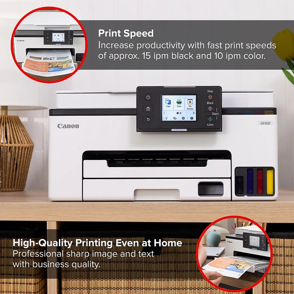 Canon MegaTank printers are a great choice for high-quality printing, value, and performance to help you get the job done. Great for hybrid working environments, the MAXIFY GX1020 has plenty of features to keep you productive from home or office, with office-like print quality. The MAXIFY GX1020 MegaTank all-in-one inkjet printer delivers high-quality, low-cost printing, and outstanding wireless connectivity in a compact size. Get serious print productivity with a high page yield of up to 3000 black and 3000 color pages with just a single set of inks. Plus, the GX1020 comes with a 3-year limited warranty or 60000 pages (whichever comes first) and is backed by Canon’s friendly and knowledgeable Service and Support network, so you can have peace of mind and focus on the business. The GX1020 is easy to set up and maintain and offers great media versatility to print on various media types and sizes, including photo paper, envelopes, banners, and more. Create beautiful and professional posters, banners, and signage with Poster Artist Online. Print both documents and photos on various paper types using a four-color pigment-based ink system for sharp black text and dye-based colors for vivid photos up to 8.5″ x 14″.