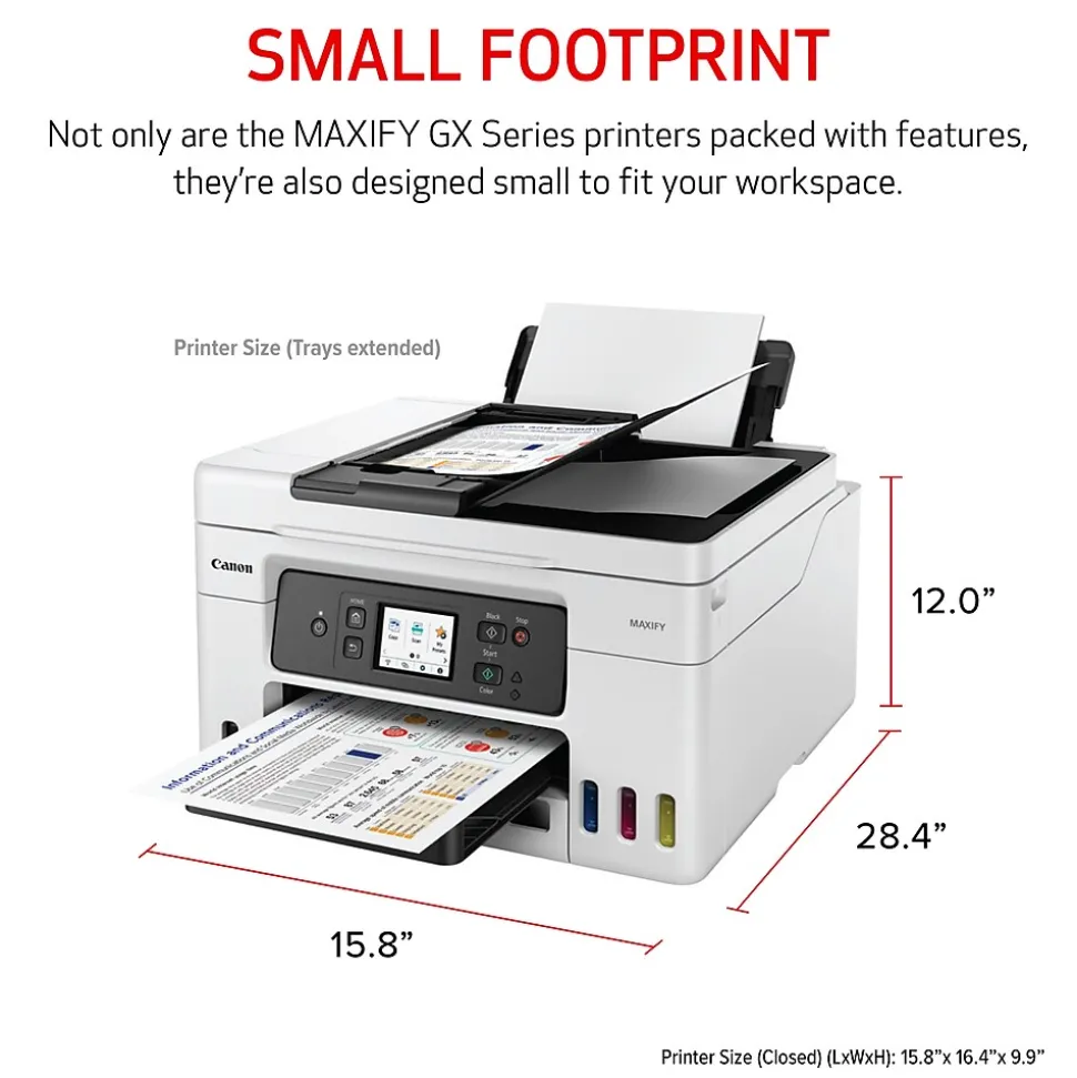 Designed for small- and mediumāsize businesses, the Canon MegaTank MAXIFY GX4020 model balances speedy performance and minimal maintenance. A 2.7″ color screen delivers an intuitive user experience. Both the print head and maintenance cartridge in the MAXIFY GX4020 are easily replaceable should the need arise. No service visit calls required. With a four-color pigment ink system, you’ll get crisp color and black-and-white documents, along with sharp highlighter-resistant text. Create and print professional posters, banners, and signage with the PosterArtist online version. Print from your favorite mobile devices using the Canon PRINT app, Apple AirPrint, and Mopria Print Service.