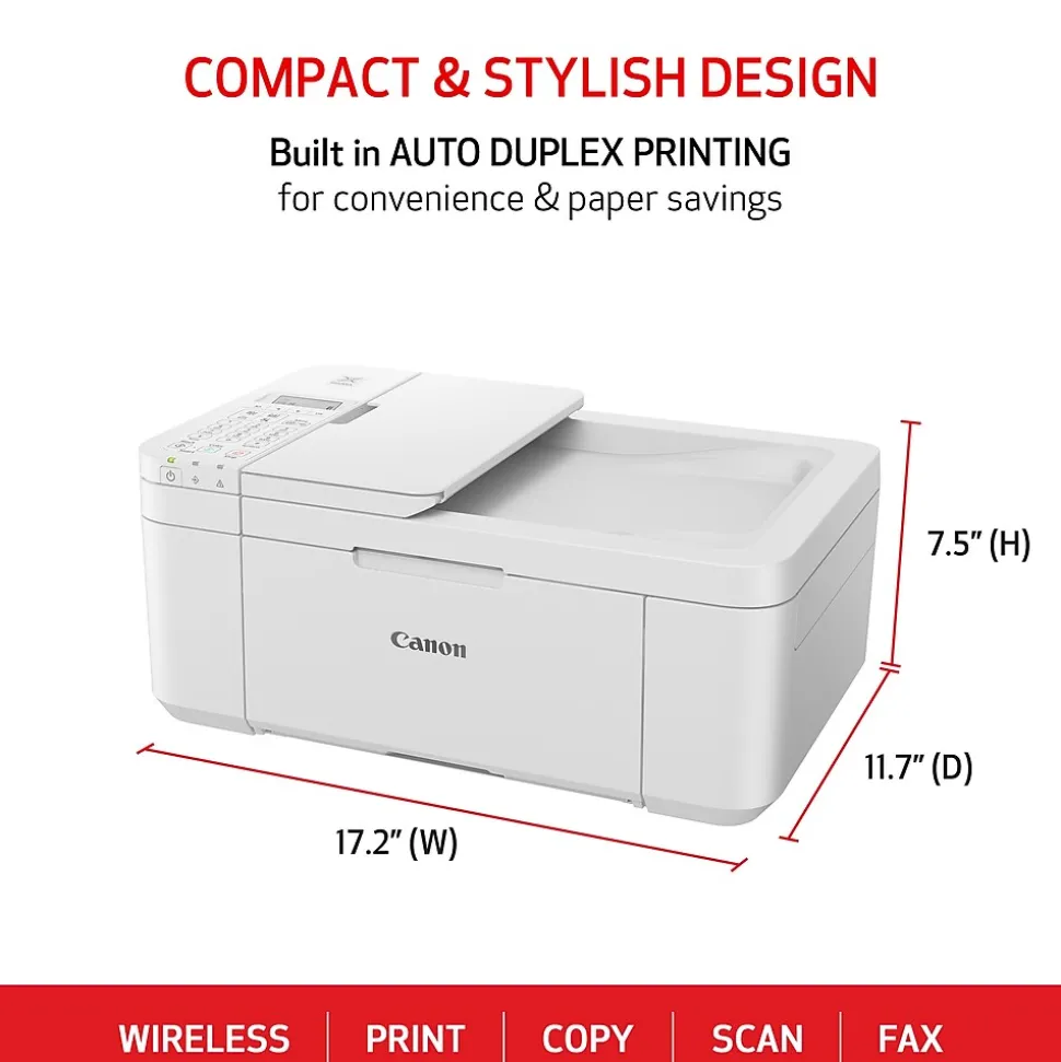 For all your work or home printing needs, the Canon PIXMA TR4720 wireless all-in-one printer has you covered. Big on performance, the PIXMA TR4720 is equipped with auto two-sided printing, an auto document feeder for multipage scanning, and built-in fax functionality. With a variety of connectivity options, you’ll be able to do it all from your PC or mobile devices. Plus, the PIXMA TR4720 is compatible with Canon apps for printing, scanning, creative projects, and more. Simple, productive office and home printing in a compact size: that’s the PIXMA TR4720. The PIXMA TR4720 is also compatible with the Canon PIXMA Print Plan Ink Subscription Service with flexible plans available where ink is delivered hassle-free right to your door automatically when you run low!