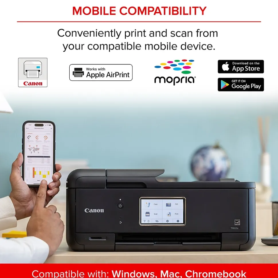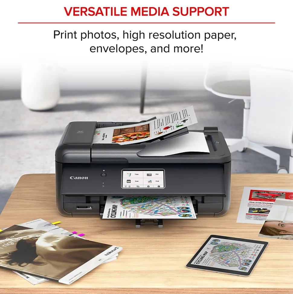 When you need a compact home office printer that can handle all your work needs, the Canon PIXMA TR8620a has you covered. With front and rear paper feeding, an individual ink system, 4.3″ LCD touch screen, and impressive wired and wireless connectivity options, you’ll be able to do it all. The PIXMA TR8620a can easily transition from scanning a multipage contract with the built-in auto document feeder to printing double-sided homework assignments from online classrooms systems, or a family photo wirelessly from your smartphone. Whether it’s printing documents and reports, or faxing and scanning, the PIXMA TR8620a is the ultimate compact home office printer that’s big on performance and productivity.