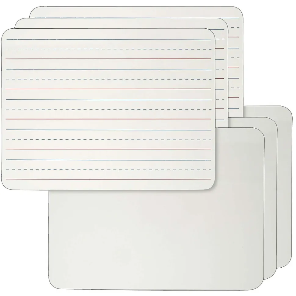 Dual sided, pre-printed lines on one side and blank on the other offers endless uses. Blank side works great for classroom games, math lessons and reminders. While our pre-printed side is great for penmanship and sentence writing. Durable Masonite lap boards are 9″ x 12″ and can be used with all dry erase markers. An environment friendly way to learn, as you just write, wipe off and re-use with no waste. Pack of 6 boards.