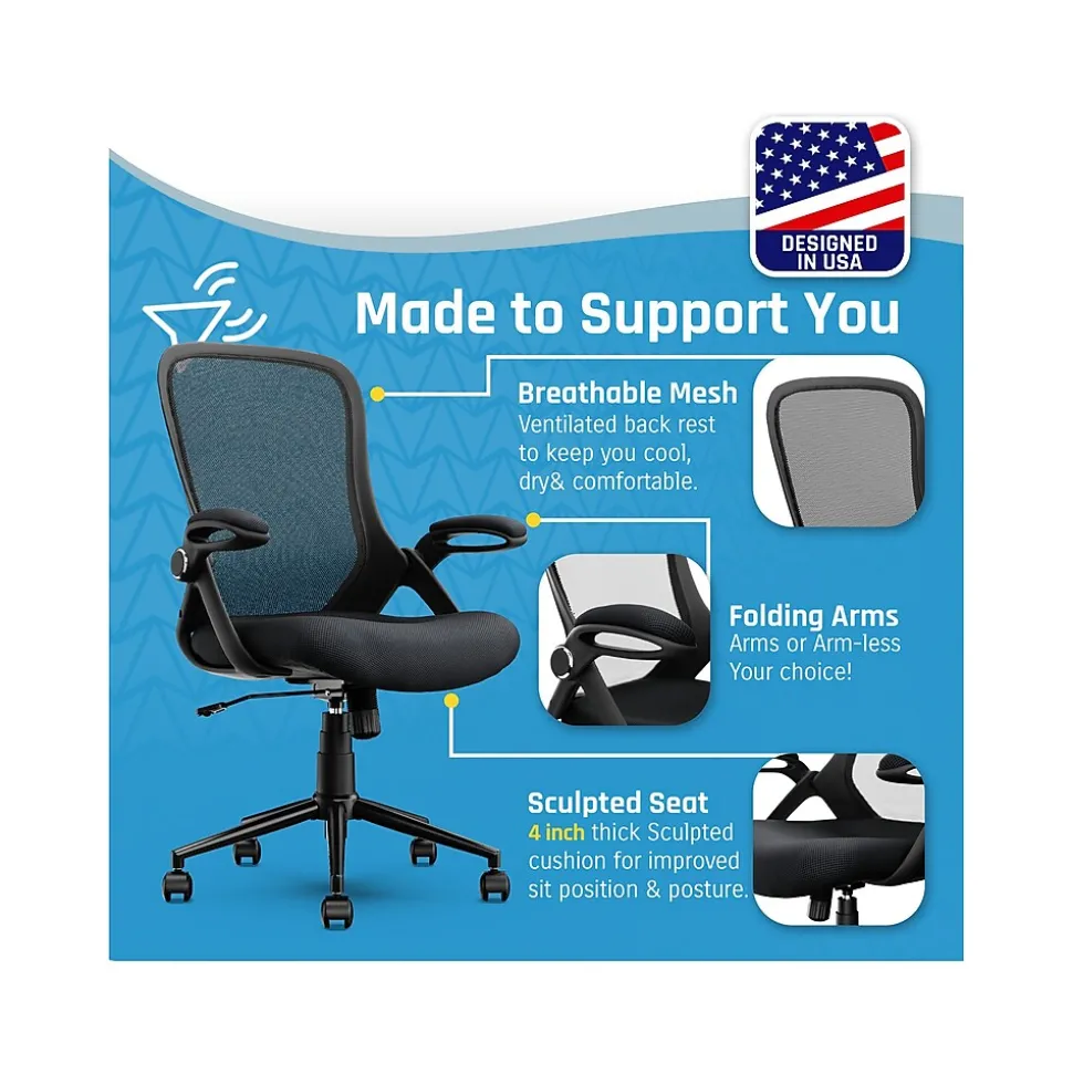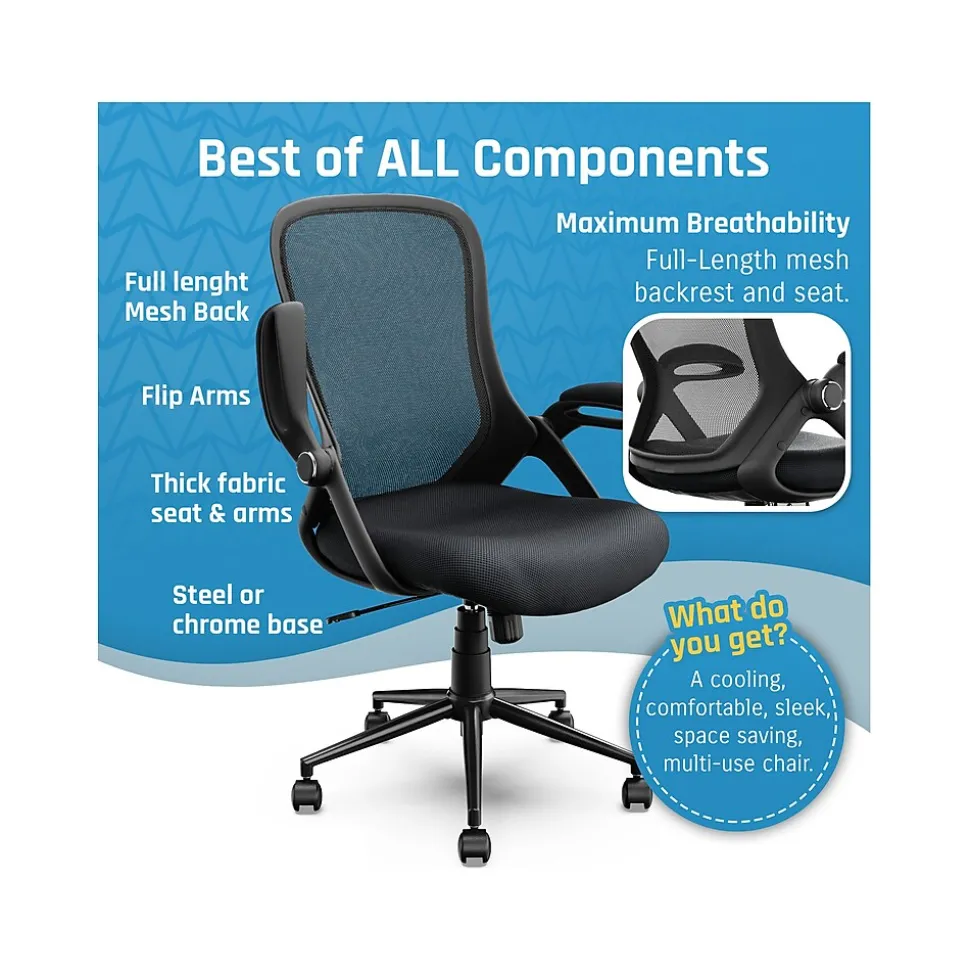 The Click365 mesh task chair features a sleek and modern design that will give any professional a competitive edge. The breathable mesh back allows for ventilating airflow, while the extra-soft seat cushion keeps you comfortable for long hours of work. Cushioned adjustable armrests can be flipped up, so the chair fits under any desk for saving space. The heavy-duty metal base is built to increase longevity and durability. This task chair is perfect for everyday use at home, in the office, or any shared workspace.