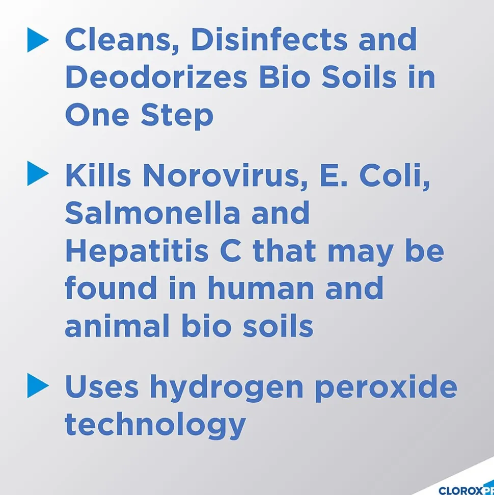 CloroxProâ„¢ Disinfecting Bio Stain & Odor Remover disinfects and removes the toughest odors and stains in one step. This bleach free stain and odor remover uses hydrogen peroxide technology to kill HIV, herpes, and flu virus in 30 seconds, kills hepatitis B and hepatitis C in 1 minute, and kills norovirus, E. coli, Salmonella and MRSA in 5 minutes. It meets EPA criteria for use against SARS-CoV-2, the virus that causes COVID-19. Compliant with OSHA Bloodborne pathogens standard, Disinfecting Bio Stain and Odor Remover works on stains from blood, feces, vomit, sweat, saliva, and urine. This versatile disinfectant can be used to clean many different hard and soft surfaces such as walls, tile, grout, concrete, carpet, fabrics, upholstery, toilets, counter tops, mattresses, and it can even be used as a pre treatment for laundry. Ideal for hotels, care centers, schools, offices, restaurants and other commercial facilities. CloroxProâ„¢, where clean means everything. Packaging may vary.