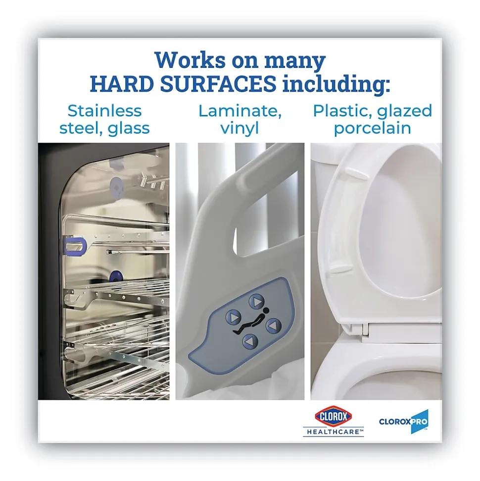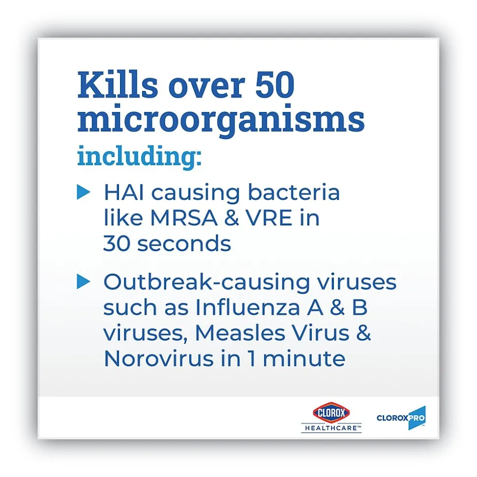 Healthcare professionals trust Clorox Healthcare Bleach Germicidal Wipes to help them overcome infection control challenges in a constantly changing healthcare environment. Clorox Healthcare Bleach Germicidal clinical wipes are ready to use, 1 step cleaner containing a 1:10 bleach dilution to meet CDC and OSHA guidelines for disinfecting surfaces in healthcare settings. Designed for daily disinfection, high-touch surfaces and medical equipment. These wipes are EPA registered to kill a total of 58 microorganisms, including HAI causing bacteria like MRSA and VRE in 30 seconds, outbreak causing viruses such as Influenza A and B viruses, Measles virus and Norovirus in 1 minute and C. difficile spores, TB and fungi in 3 minutes. These wipes kill 99.9999% of C. difficile spores, according to the current EPA recommended testing standard (June 2014). These wipes are engineered minimize residue and leave less visible residue on surfaces vs. competitor bleach wipes. They are formulated with an anticorrosion agent and are compatible with common healthcare surfaces including stainless steel, glass, plastic, porcelain, glazed ceramic, laminated surfaces and vinyl. Intended for use in healthcare settings.