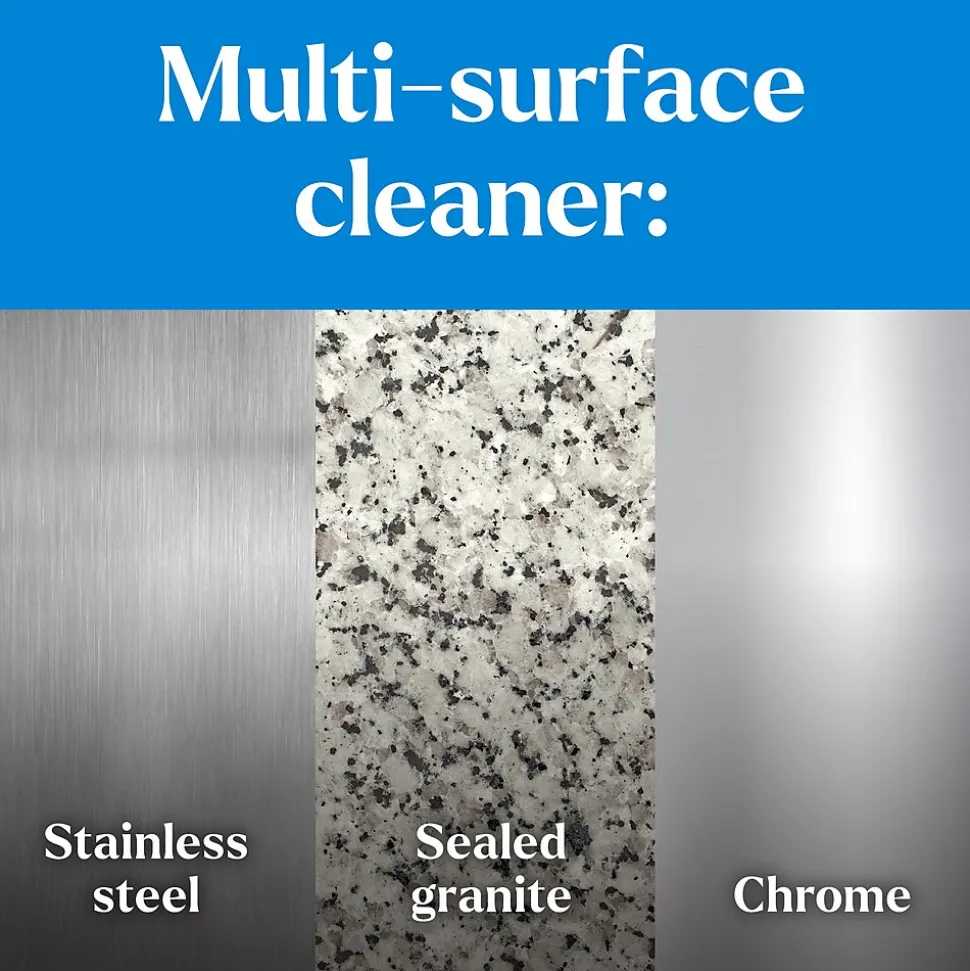 - USE ON A VARIETY OF SURFACES: Safe on multiple surfaces throughout the kitchen and bathroom, including counters, appliances, stainless steel, sealed granite, chrome, cooktop hoods, sinks and toilets