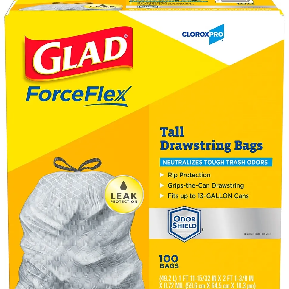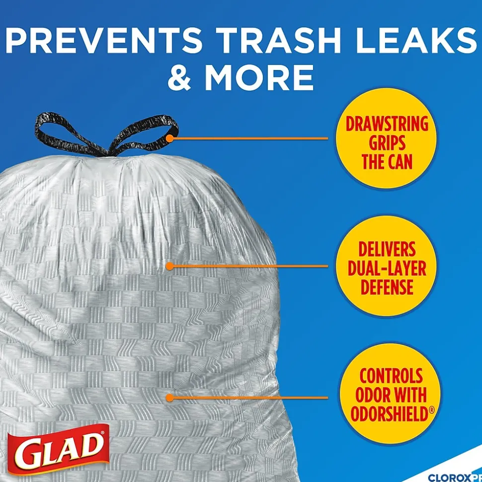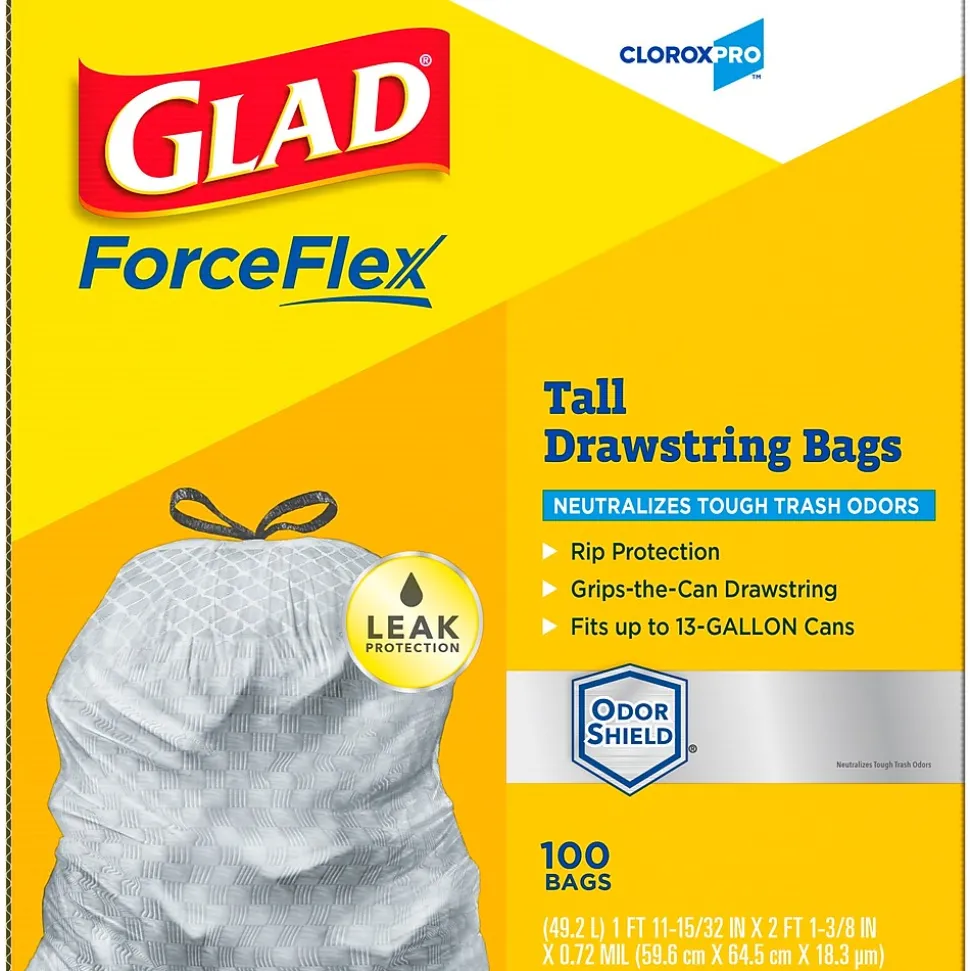 - 13 GALLON PLASTIC TRASH BAGS: These Tall Kitchen Drawstring Trash Bags from CloroxPro Glad ® trap, lock and neutralize odors to keep your rooms smelling fresh with OdorShield