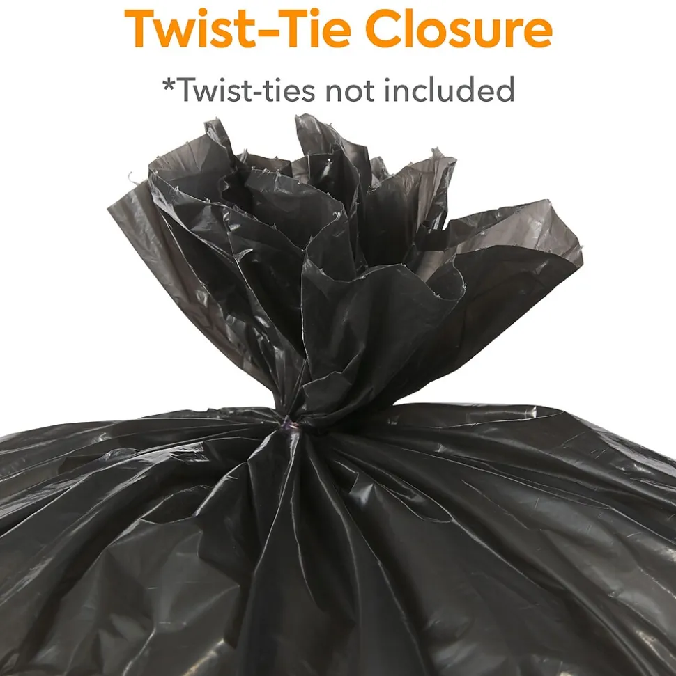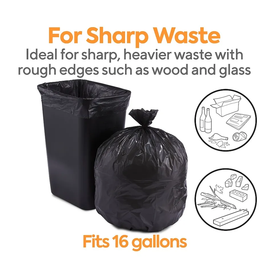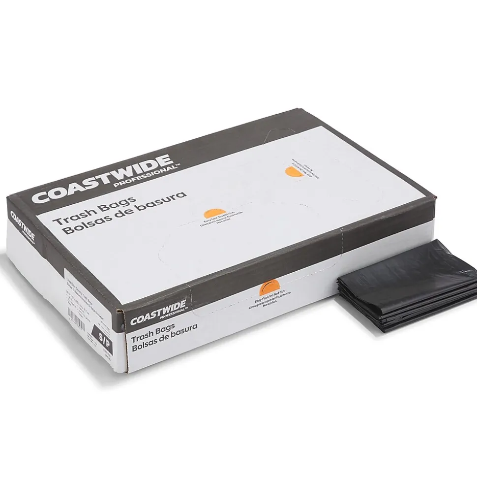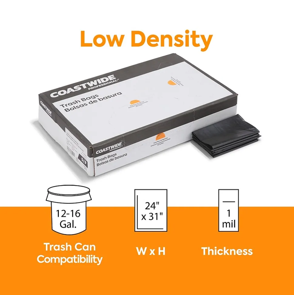Keep workplaces free of office and food waste with these trash bags. The black coloring blocks refuse from sight, ideal for preserving privacy and disposing of sensitive materials. Low-density plastic resists stretching under the weight of heavy loads, and the tear-resistant design makes carrying sharp items easy. These Coastwide Professional™ black low-density trash bags fit in small garbage receptacles and hold up to 16 gallons of waste so you can go longer before emptying.