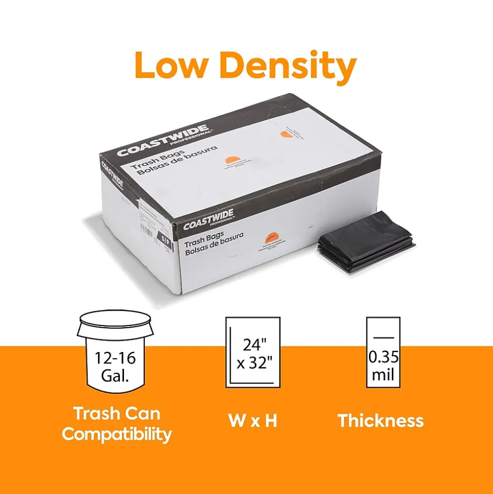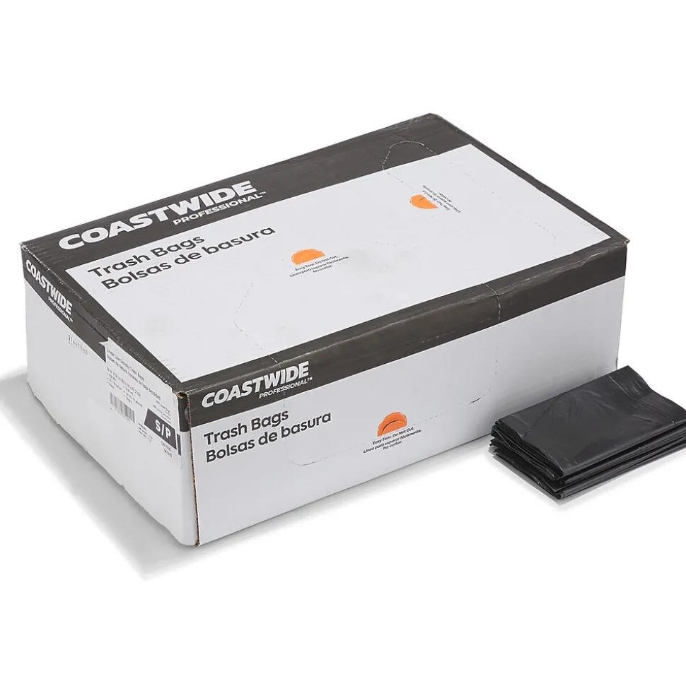 Enjoy easy storage with these low-density trash bags. A dual opening allows vertical or horizontal access, and the black color keeps contents concealed for discretion. Designed for industrial waste disposal, these heavy-strength 0.35-mil garbage bags hold sharp and wet objects without leaks or tears. The star-shaped bottom on these Coastwide Professional™ trash bags allows the liner to take the shape of the waste bin, leveling trash for easy lifting.