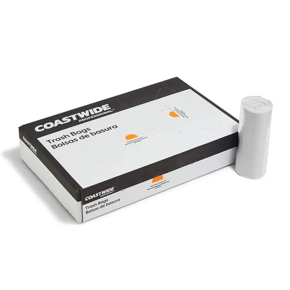 Reduce waste and clean heavy messes with trash bags made from 30% post-consumer recycled content. Capable of handling up to 23 gallons of waste, these Coastwide Professional™ 30% PCR Trash Bags are low-density, making them tear-resistant and able to contain sharp or rough materials. Make stocking up on essentials simple and more eco-friendly with this box of 250 durable garbage bags that will fit medium trash cans.