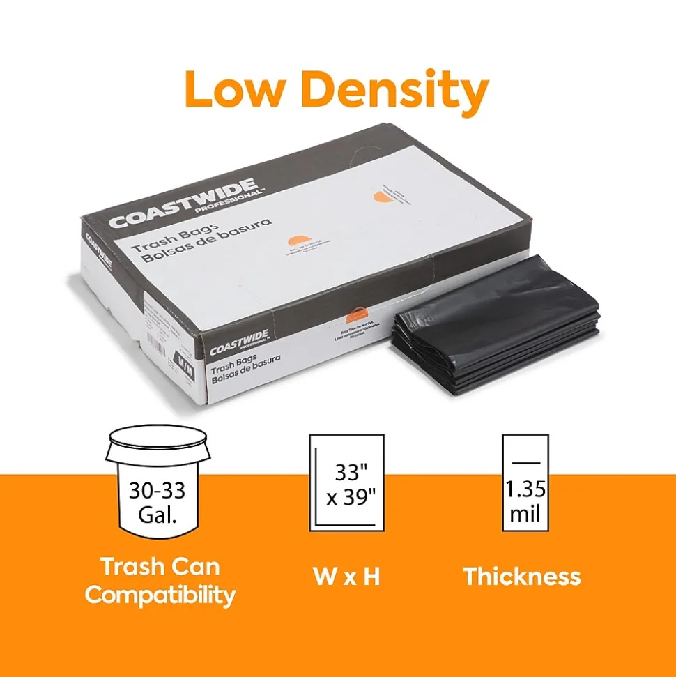 Prevent spills with these black trash bags. The star-sealed bottom distributes weight evenly and prevents leaks for safe garbage handling, while the carton of 150 provides an ample supply before restocking is needed. These 1.35-mil-thick Coastwide Professional™ trash bags hold 30 to 33 gallons of waste, which is suitable for office kitchens, breakrooms and other public spaces, and are made of reprocessed resin to resist ripping and enhance durability.