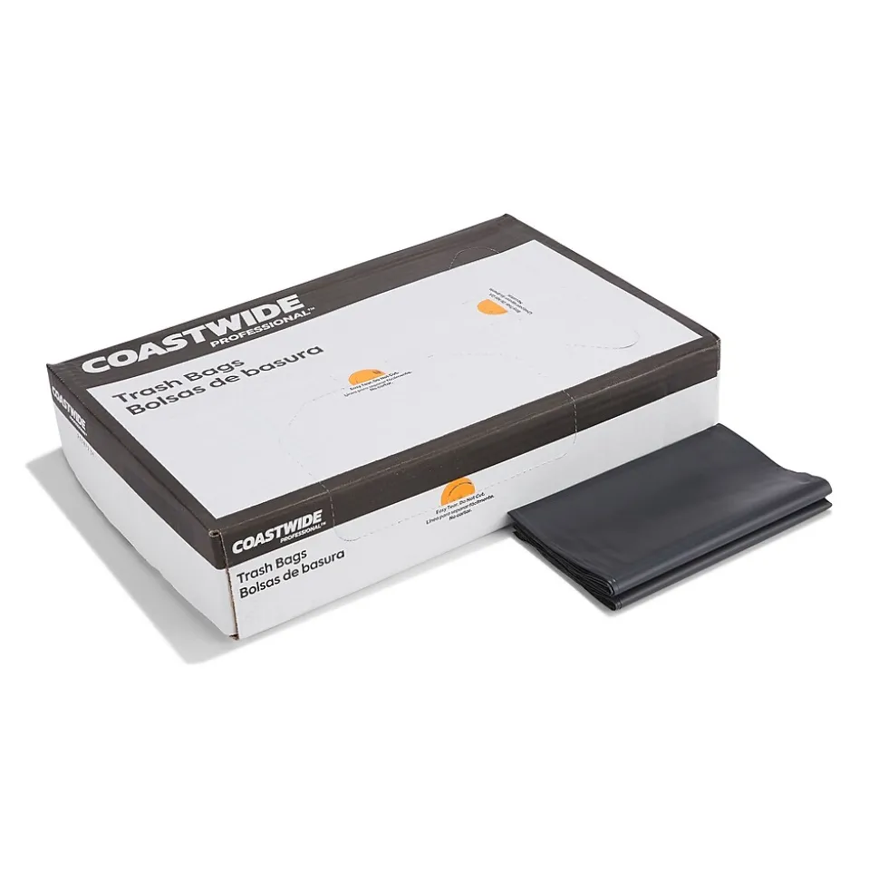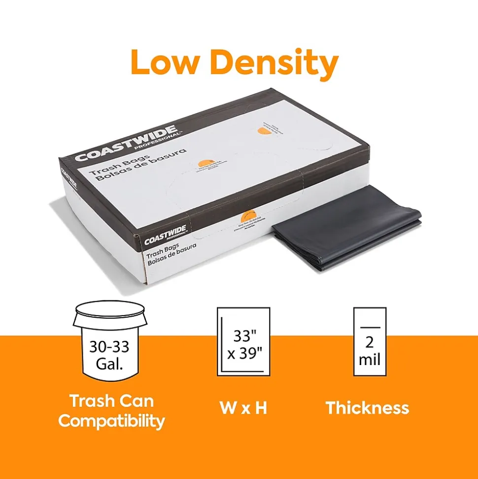 Keep contents of garbage cans private with these opaque trash bags. The 30 to 33-gallon capacity provides compatibility with a variety of large office garbage receptacles and accommodates plenty of refuse before requiring disposal. These star-sealed Coastwide Professional™ 2-mil black reprocessed resin trash bags use durable low-density resin that resists stretching and tearing when carrying heavy loads.