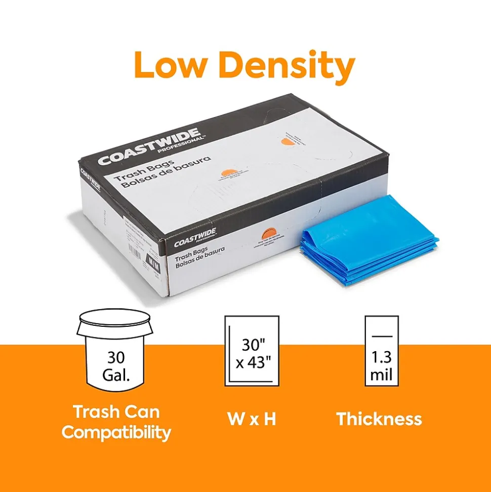 Ensure your workspace is safe from contamination with these biohazard trash bags. The blue color is easily visible to ensure cautious handling and opaque to hide the contents, and the 30-gallon capacity is compatible with industry-standard cans for a snug fit. These Coastwide Professional™ biohazard trash bags meet federal and state regulations for tear and dart impact resistance to ensure safe waste disposal.