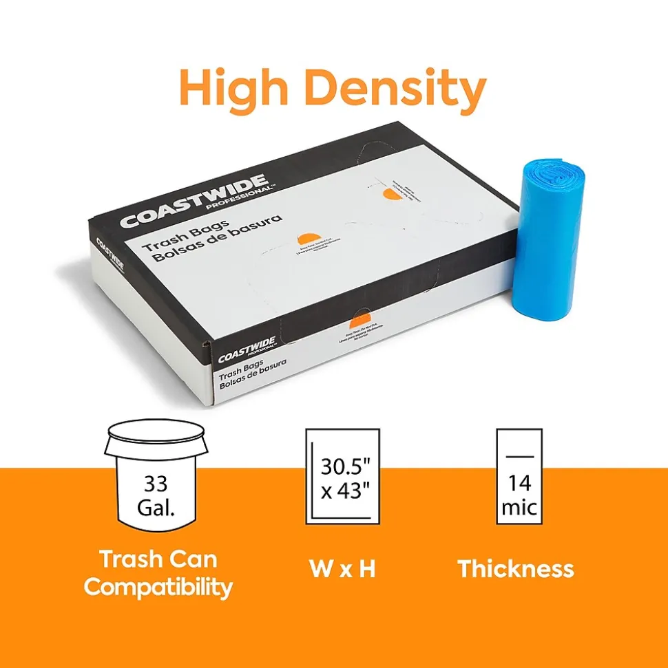 Maintain an orderly and sanitary workplace with these trash bags. The high-density polyethylene material offers superior lifting strength and durability, and the heavy-strength construction easily handles everyday trash. These Coastwide Professional™ blue high-density trash bags come in cartons of 250, so you can stock every exam room or the supply closet, and have a 33-gallon capacity that fits plenty of trash before filling up.
