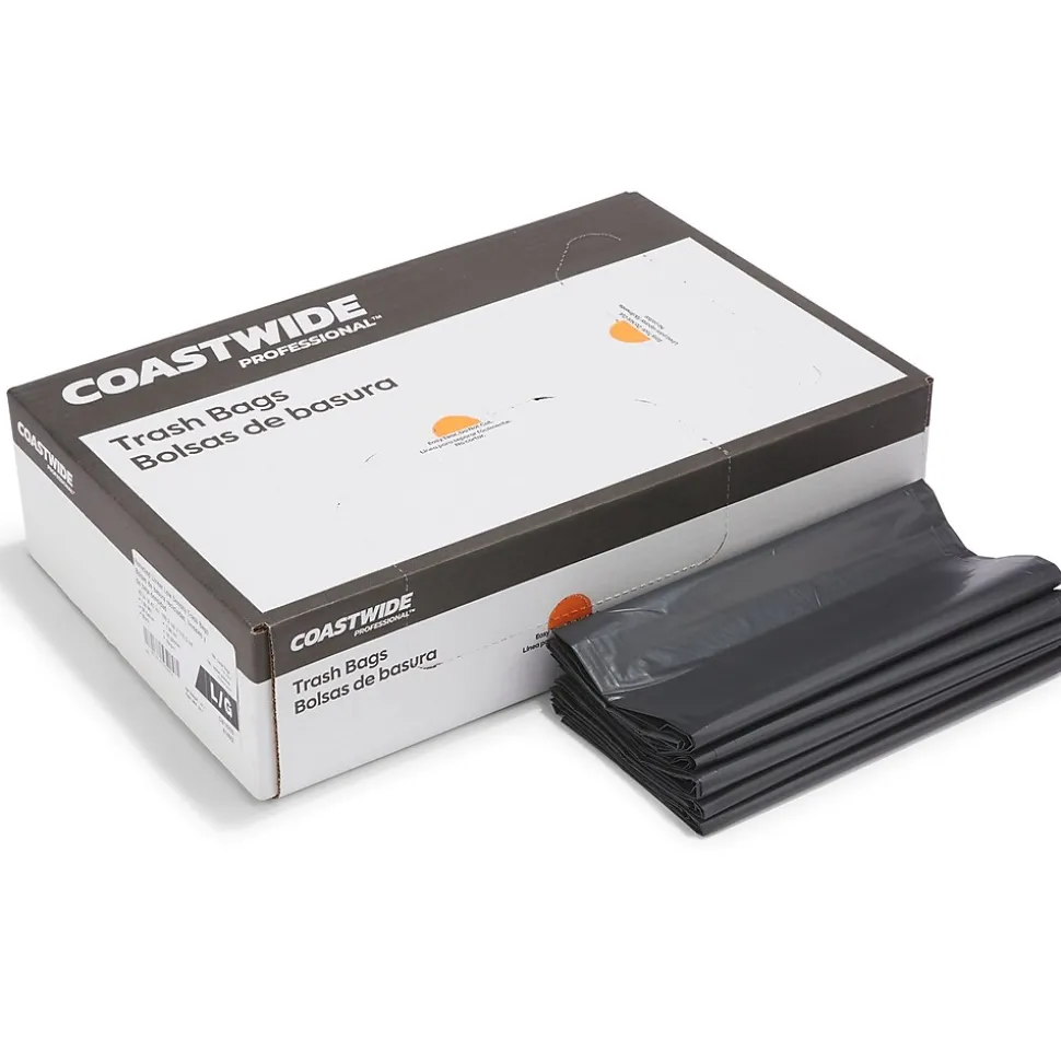 Enjoy versatility and efficiency with these low-density trash bags. Manufactured with prime resin, these garbage bags offer durability to handle large-scale cleanup tasks. The 56-gallon capacity and 1.8-mil thickness help contain liquids and prevent rubbish from poking through. A star-sealed bottom distributes refuse evenly for simple lifting and carrying. Boasting a top-side dual dispenser, these Coastwide Professional™ trash bags store vertically or horizontally for easy dispensing.