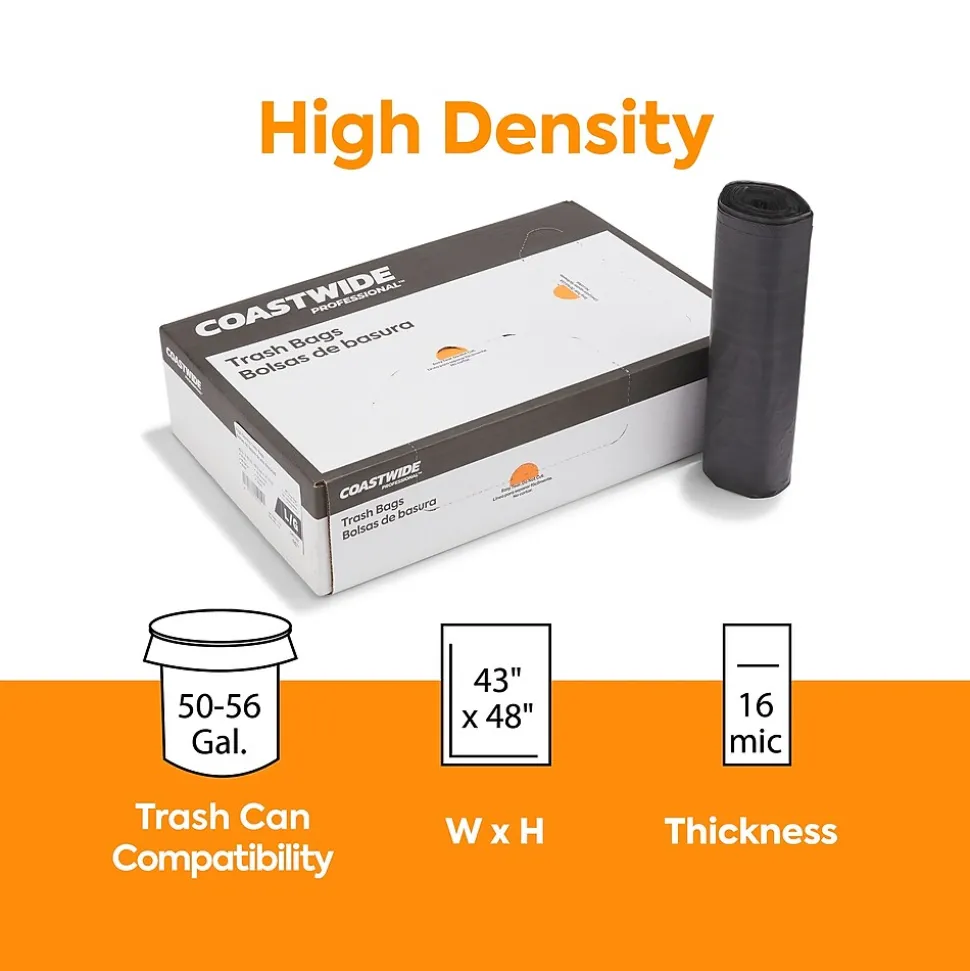 Employ simple storage and cleanup with these high-density trash bags. Strong and durable, these bags keep rubbish and wet objects inside the liner. A star-sealed bottom conforms to the bin’s shape and settles the contents, so you can slip the bag out of the can without ruptures or leaks. These Coastwide Professional™ trash bags feature a dual opening for horizontal or vertical storage and access.