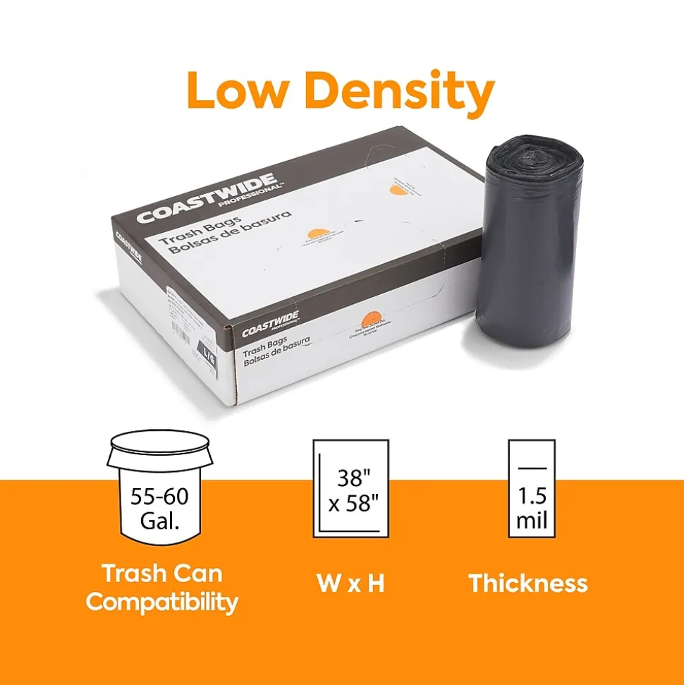Reduce the risk of spills around your break room, cafeteria or other shared space with these reprocessed resin trash bags. The star-sealed bottom distributes weight evenly to prevent leaks or tears, while the black material conceals the content to ensure discretion. Boasting a 55 to 60-gallon capacity, these Coastwide Professional™ trash bags have plenty of room, making them suitable for busy environments, and come in a carton of 100 to provide an ample supply.