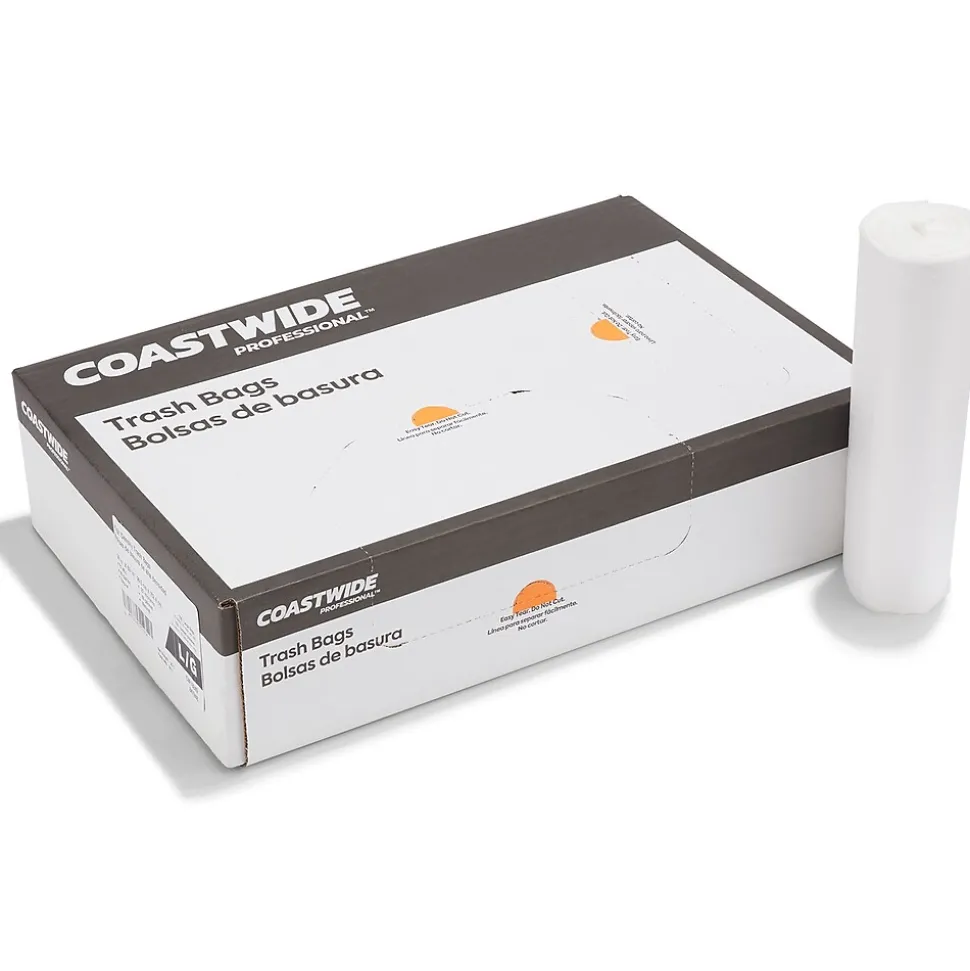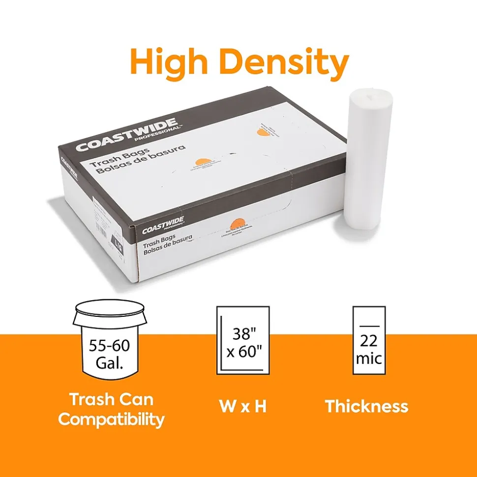 Keep high-traffic areas litter-free with these transparent trash bags. The 55 to 60-gallon capacity is ideal for use in commercial establishments and public places, while the 22 mic. thickness and high density offer industrial strength and stay intact when lifted. This carton of 150 Coastwide Professional™ natural high-density trash bags comes with 10 rolls for a lasting supply and easy dispensing.