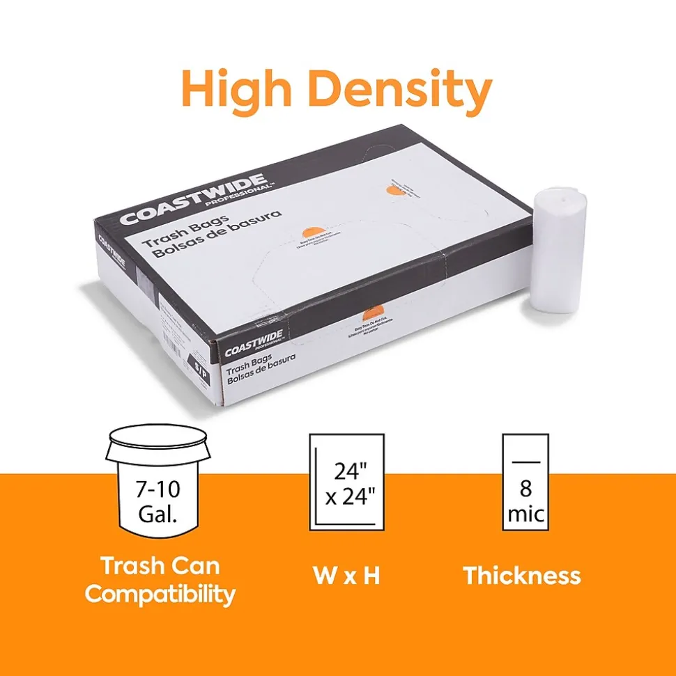 Hold up to 10 gallons of kitchen or office waste with these trash bags. The clear material lets you know when your bin is filling up and needs emptying, while the star seal conforms to your bin’s shape for even weight distribution. These Coastwide Professional™ high-density trash bags come in a 1,000-piece carton, making them ideal for business operations with multiple trash bins.