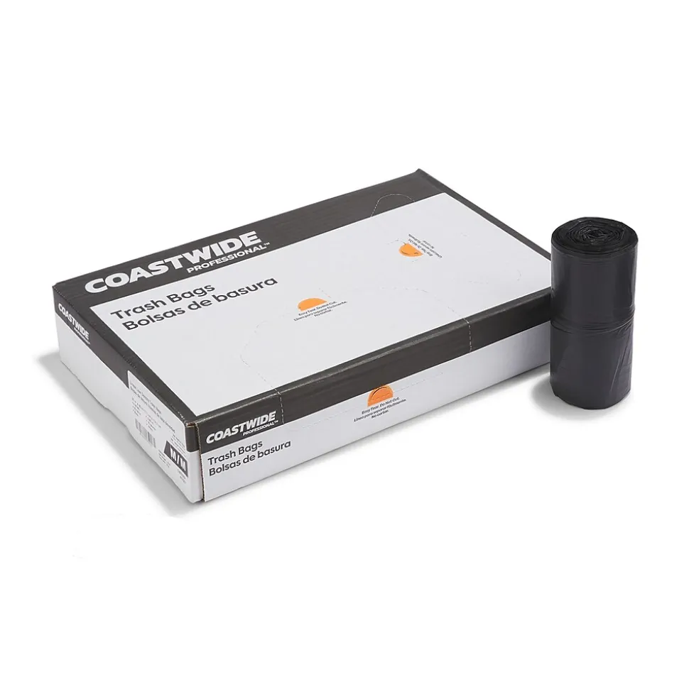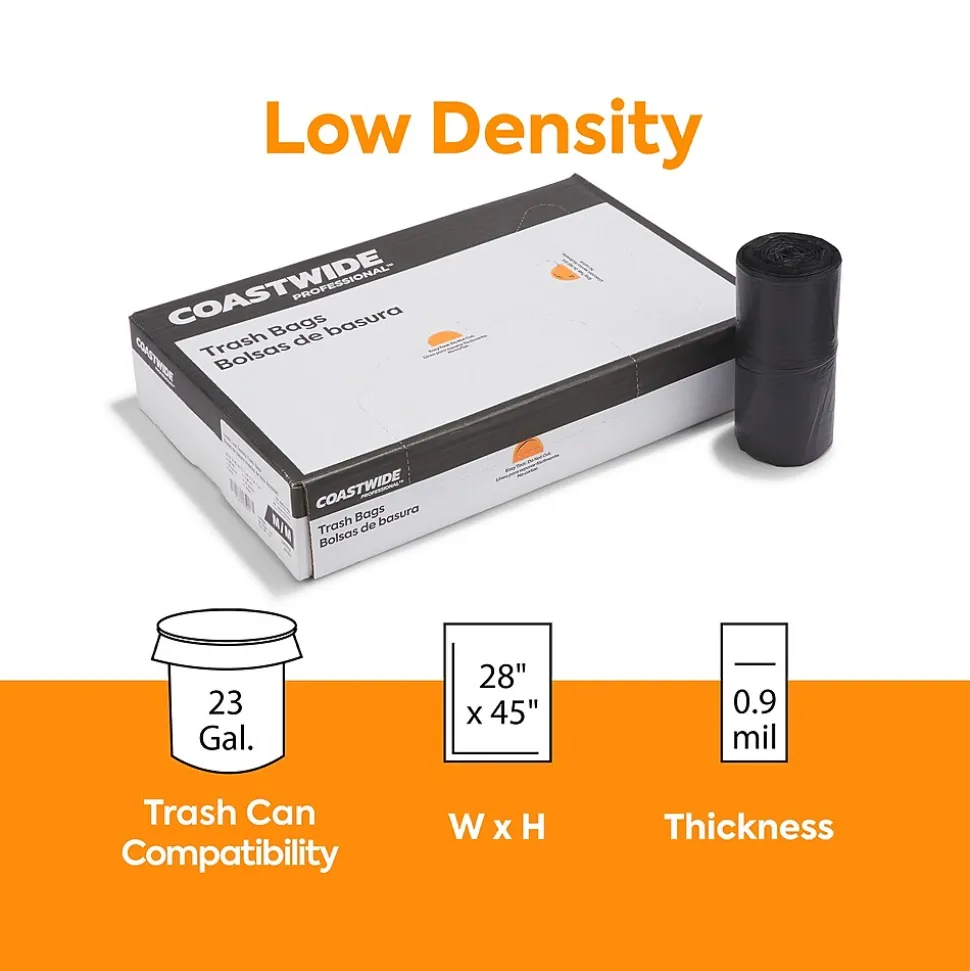 Clean up your workplace with these trash bags. The black low-density polyethylene material conceals waste from sight and resists stretching and tearing when carrying heavy loads and wet items. Capable of holding up to 23 gallons each, these Coastwide Professional™ AccuFit low-density trash bags fit easily in most break room or shared receptacles and let you throw away plenty of garbage before needing to be emptied.