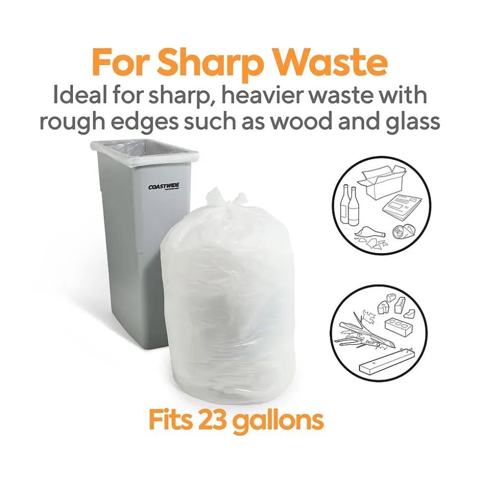 Get rid of refuse from the break room, washroom or other shared spaces with these AccuFit trash bags. The clear material delivers a view of the contents, helping prevent theft, while the low-density polyethylene prevents heavy items from stretching and ripping to avoid leaks, making them suitable for cafeterias and public areas. These Coastwide Professional™ AccuFit trash bags hold up to 23 gallons of waste as an effective maintenance solution.