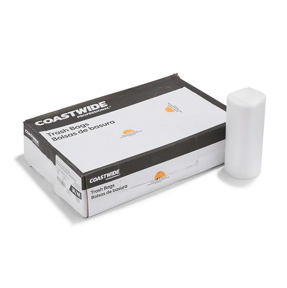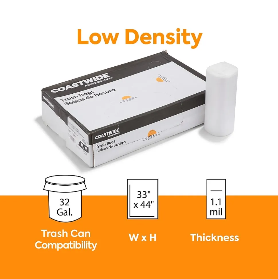 Throw away unwanted items, garbage and other waste with these durable trash bags. The clear color lets you view the contents, while the low-density plastic construction makes each bag ideal for disposing of heavy, sharp or wet objects. Each of these Coastwide Professional™ AccuFit clear trash bags has a 32-gallon capacity, making them perfect for medium-sized office environments.