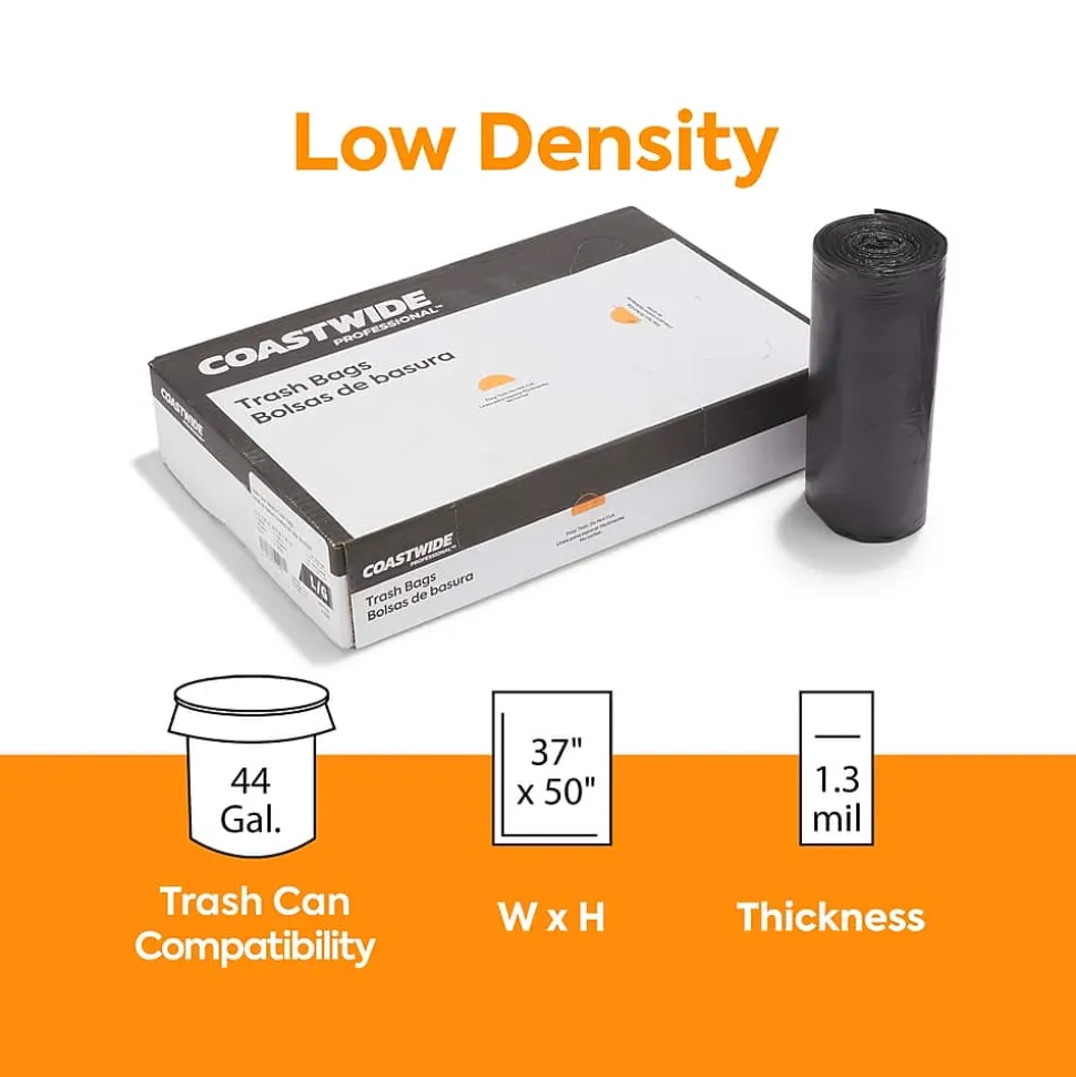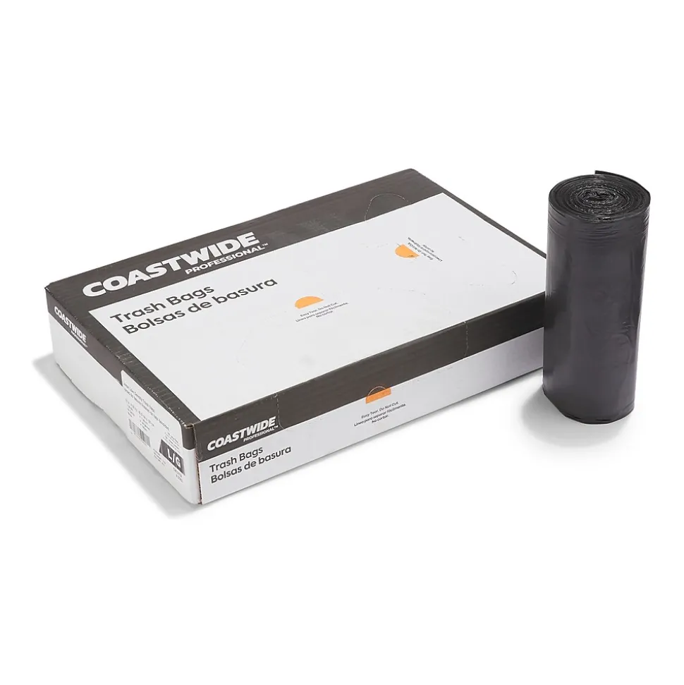 Eliminate leaks when transporting wet trash with these waste disposal bags. The polyethylene plastic construction offers extra strength when handling heavy or sharp objects, while the snap-fit hold and proper overhang ensure the bags stay in position after placement. These Coastwide Professional™ AccuFit low-density black trash bags are packed in coreless rolls for easier dispensing.