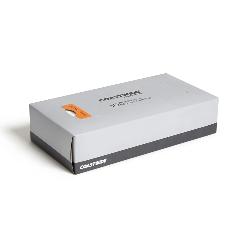 Keep your supply closet easily stocked with this carton of 30 boxes of facial tissues. The absorbent two-ply construction handles the hardest of sneezes while being soft and gentle on skin, and the convenient dispenser box lets employees and visitors grab a tissue as needed. With 100 tissues in each box of Coastwide Professional™ two-ply facial tissues, you’ve got enough for shared restrooms, break rooms and desks.